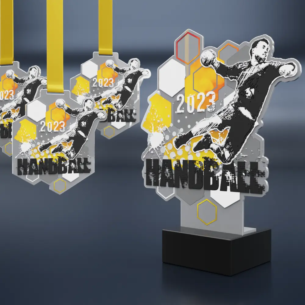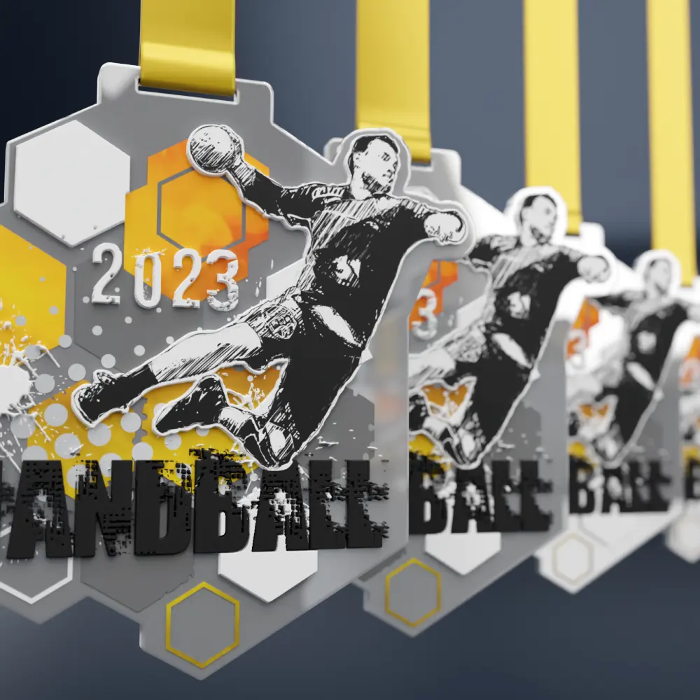 Immagina una medaglia in metallo che non solo onori la vittoria ma catturi appieno lo spirito intenso della pallamano. La nostra ultima collezione è composta da medaglie in acciaio tagliate con precisione che si adattano perfettamente all’emozionante mondo di questo sport. Con forme uniche e creative e dettagli che vanno oltre le tradizionali forme rotonde le medaglie della Lega di Pallamano si distinguono dai premi standard. Le medaglie sono ricoperte d’argento in sottile contrasto con la stampa multicolore che rende omaggio alla pallamano attraverso grafiche che ne riflettono la dinamica e l’energia. L’effetto complessivo è esaltato dall’uso di elementi di stampa 3D che aggiungono profondità. Inoltre le medaglie vengono fornite con statuette che ne aumentano l’attrattiva.