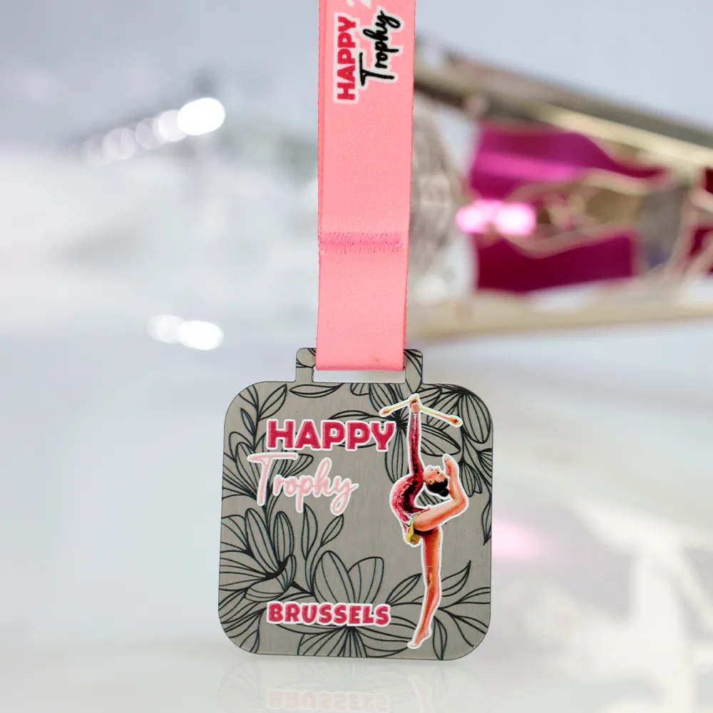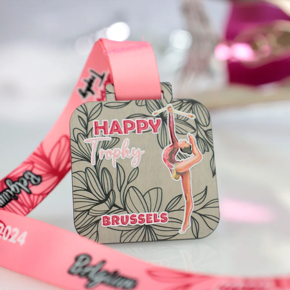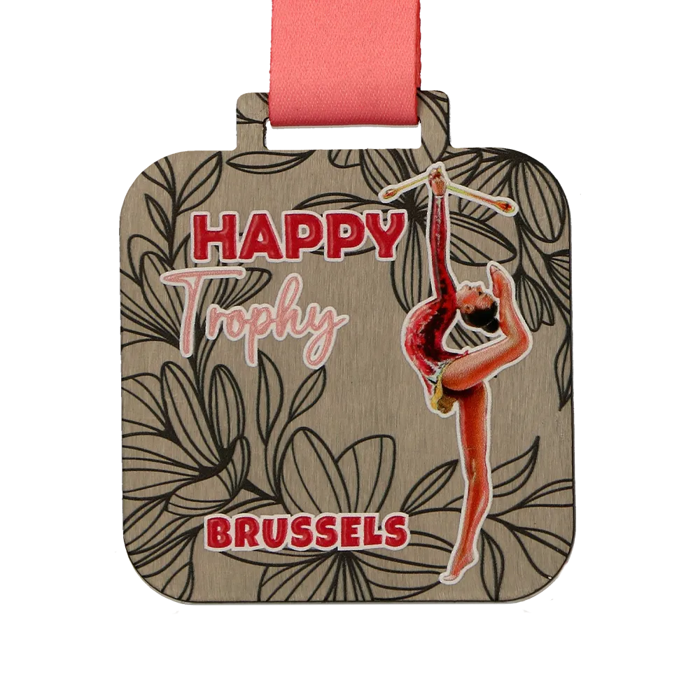 Medaglia di danza appositamente realizzata per l'evento Happy Trophy Brussels 2024. La medaglia ha una forma quadrata ottenuta attraverso un taglio laser preciso. Presenta una silhouette dinamica di una ginnasta con un elegante motivo floreale sullo sfondo. Abbiamo creato gli elementi colorati e le decorazioni utilizzando la stampa UV.