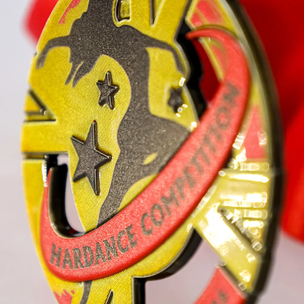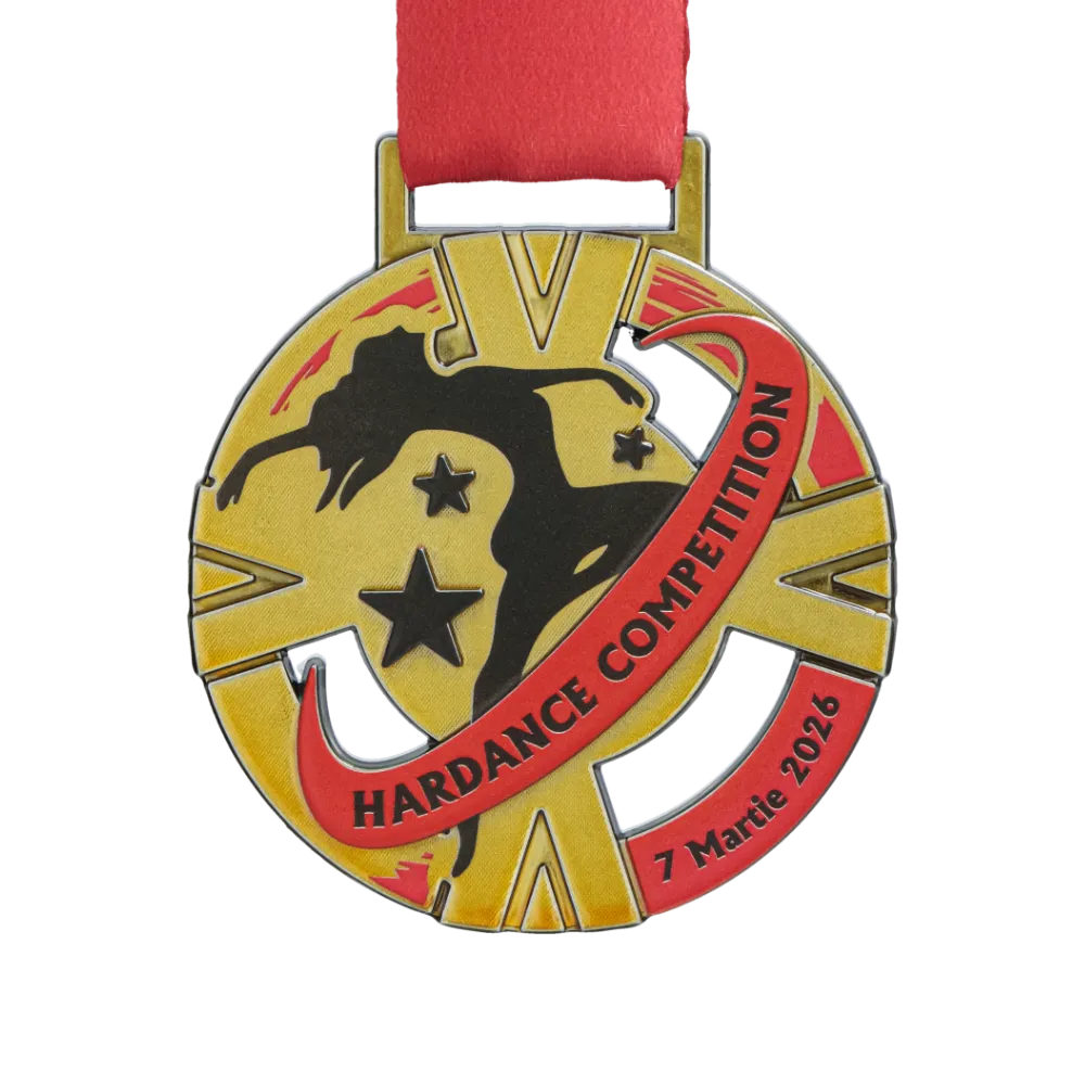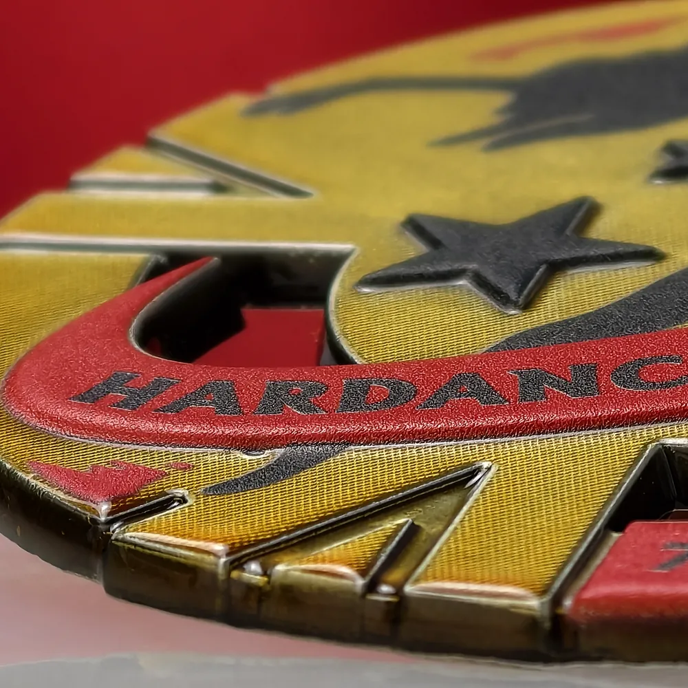 La medaglia Hardance Competition è stata prodotta in una robusta lega di zamak, che ha permesso di ottenere precisi intagli traforati nella sua forma circolare. Grazie alla combinazione tra la tecnica della fusione e la stampa 3D, dettagli come le stelle e la silhouette dinamica della ballerina presentano una struttura distinta, sensibile sotto le dita.