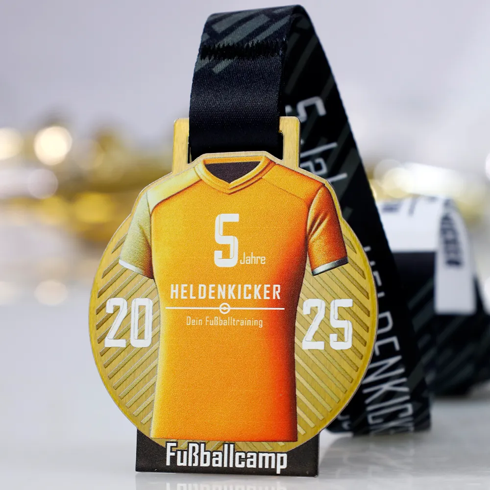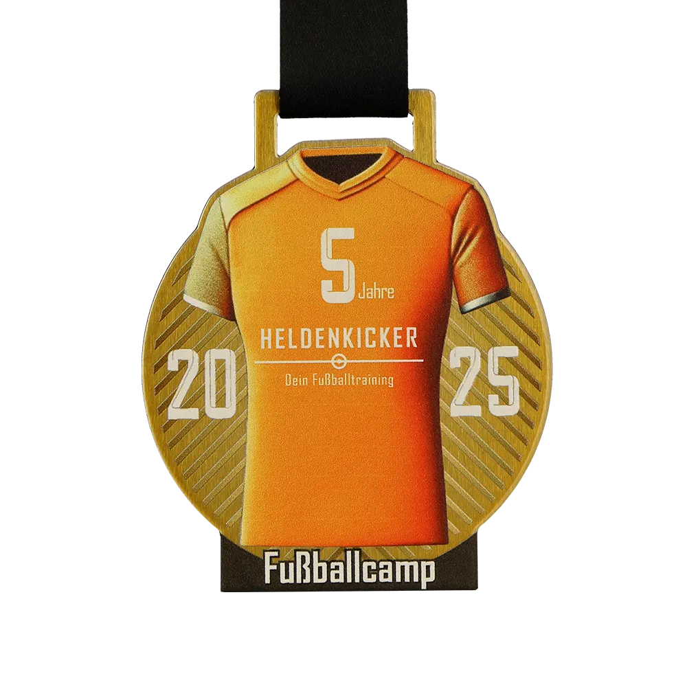 Una medaglia da calcio in acciaio con stampa UV. Progettata per un campo di calcio e il 5° anniversario di "Heldenkicker". A forma di maglia in tonalità arancioni con iscrizioni bianche e una data. Appesa a un nastro nero. Ideale come premio per giovani calciatori.