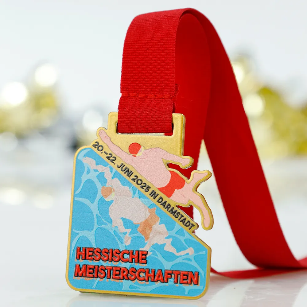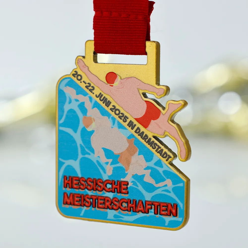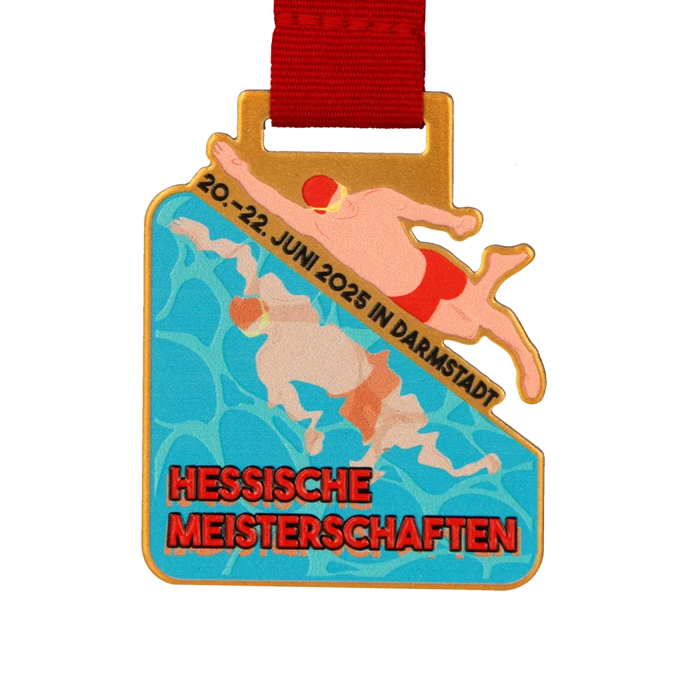Questa medaglia in acciaio con stampa UV è stata creata per i Hessische Meisterschaften a Darmstadt. Tagliata al laser con un contorno personalizzato che fa riferimento all'acqua e ai nuotatori, presenta una stampa UV a colori sul dritto con due sagome di nuotatori e acqua blu. Progettata per eventi di nuoto, troverai di più nelle nostre medaglie di nuoto.