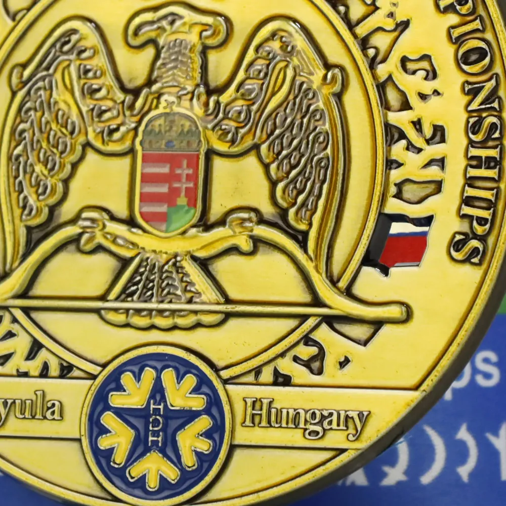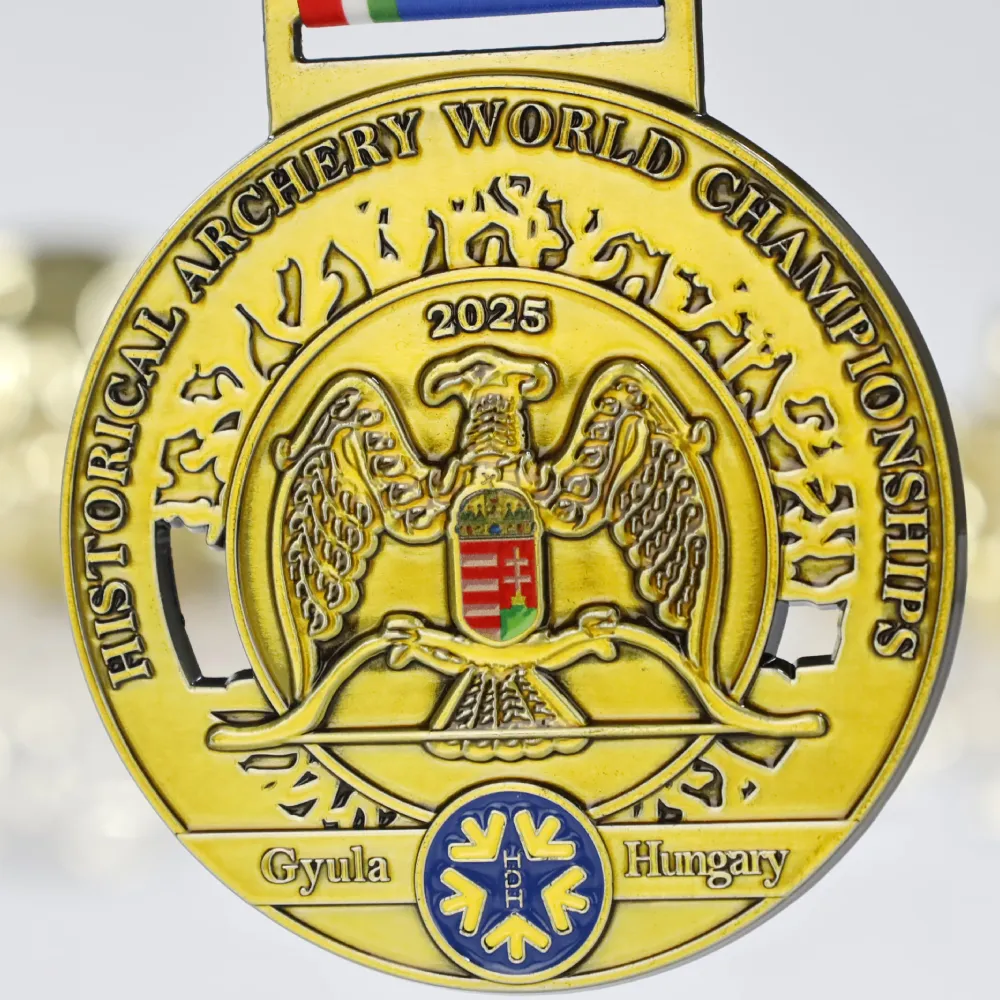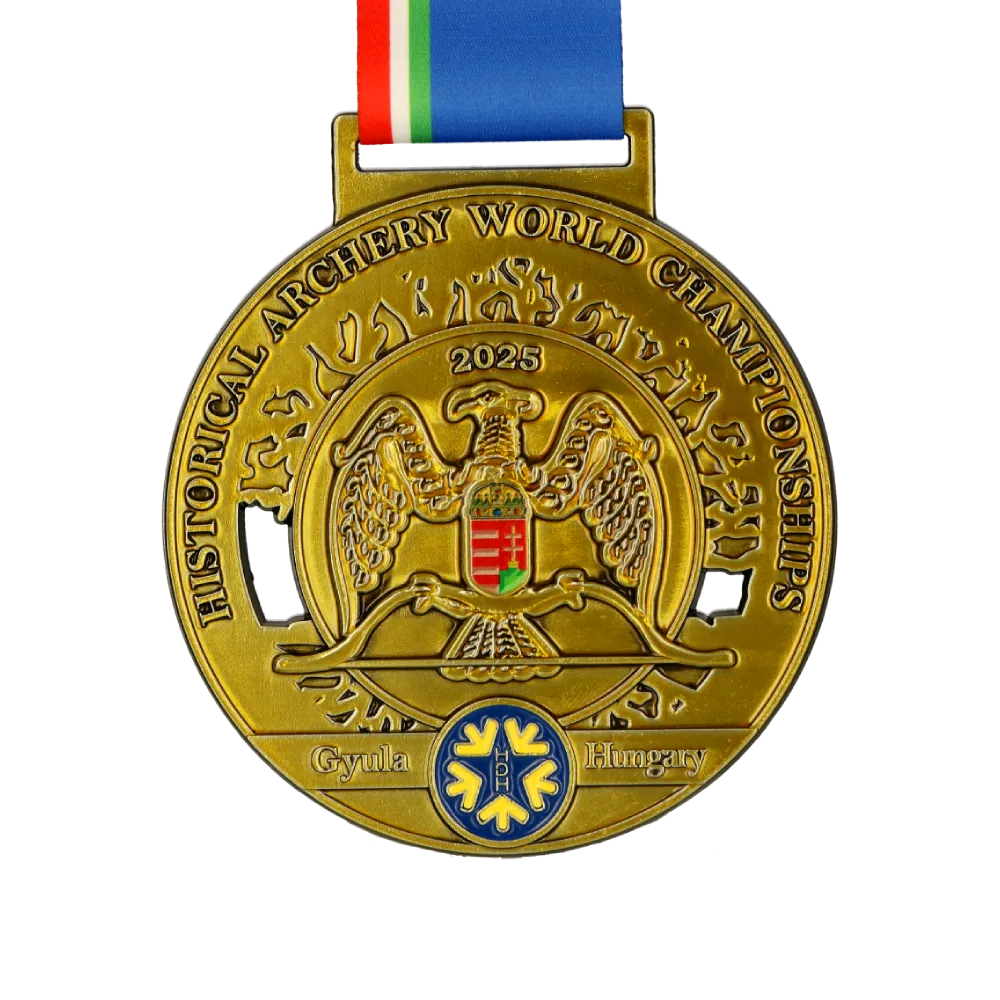 Medaglia su misura pressofusa per i Campionati Mondiali di Tiro con l'Arco Storico 2025 a Gyula, Ungheria. La medaglia è adornata con un design di aquila in rilievo che presenta lo stemma ungherese sul suo scudo, con iscrizioni in stile storico attorno al bordo. Il nome dell'evento e la località appaiono in basso. La medaglia su misura è sospesa a un nastro blu con una striscia rossa-bianca-verde, riflettendo la bandiera ungherese.