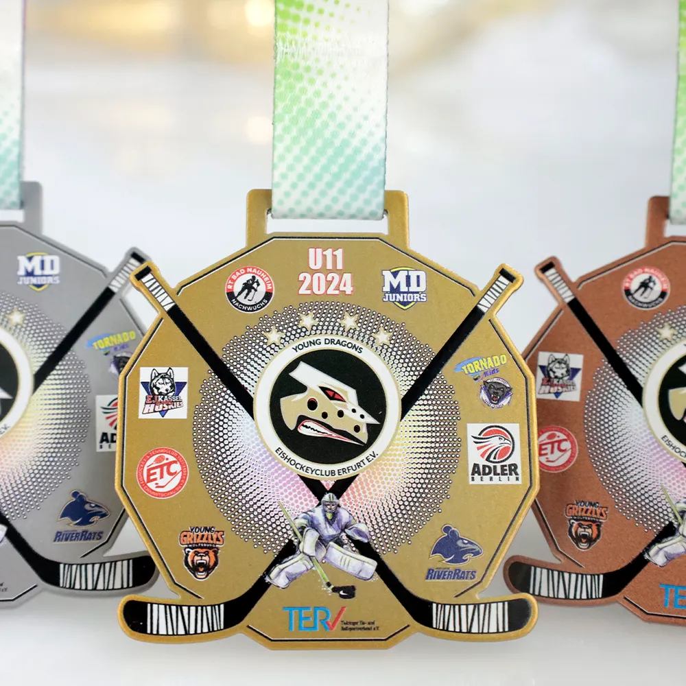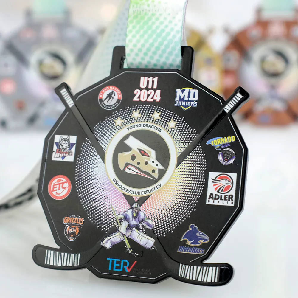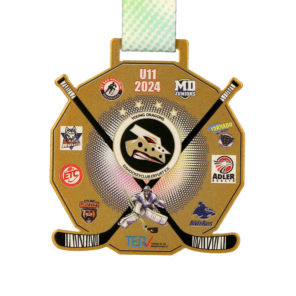 Una medaglia da hockey per i partecipanti al torneo di hockey presso l'Hockey Club Erfurt. La medaglia è adornata con loghi delle squadre, bastoni da hockey incrociati e un'immagine dinamica di un portiere. Questa medaglia cattura perfettamente l'essenza e lo spirito dell'hockey, rendendola un trofeo eccellente per qualsiasi torneo di hockey.
