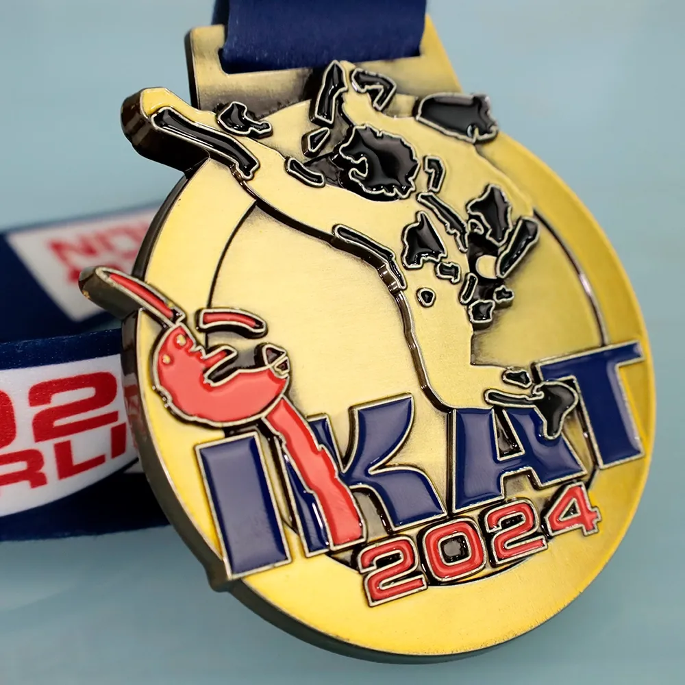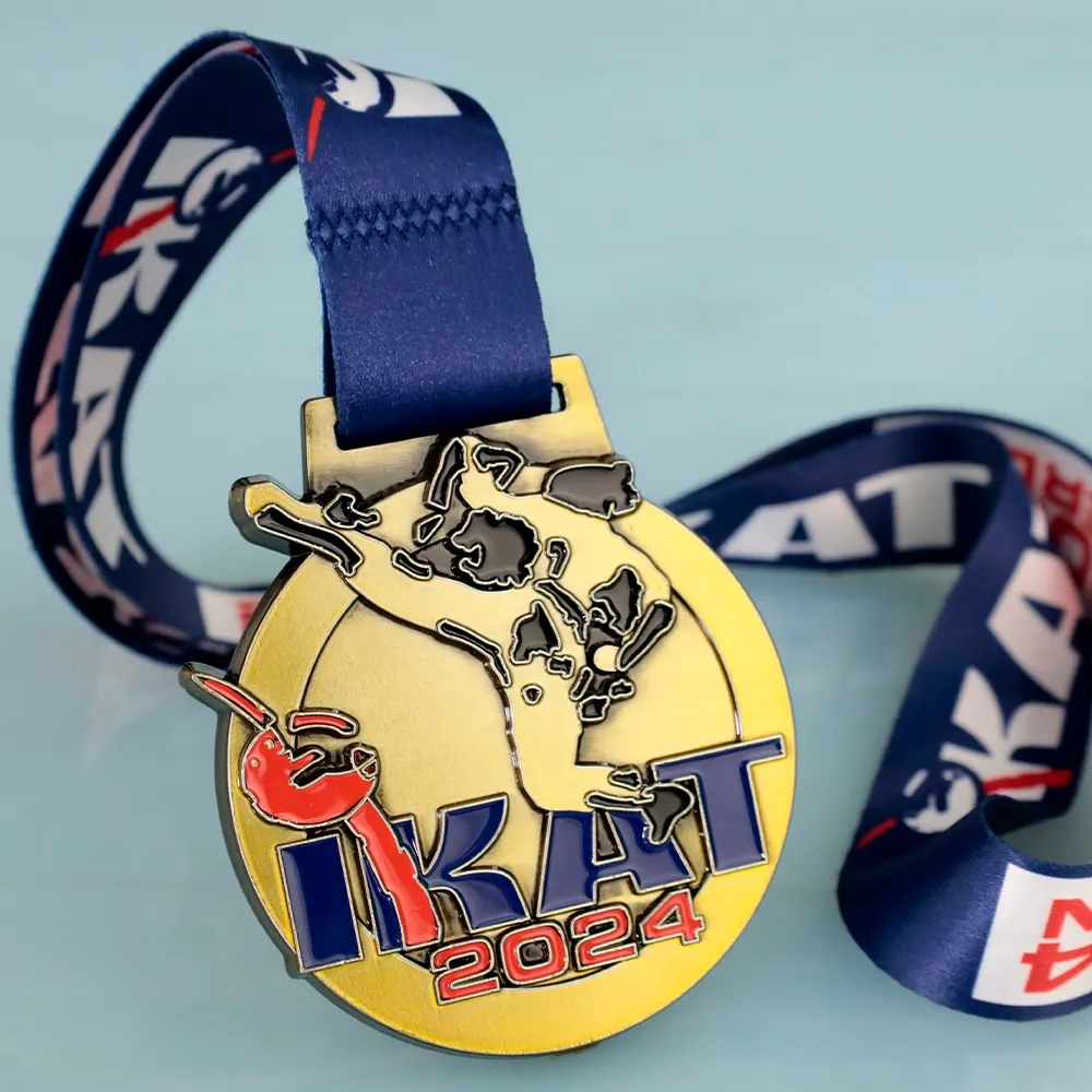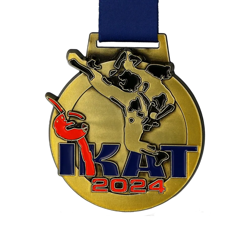 Poiché le medaglie su misura sono la nostra specialità abbiamo approcciato il design per questo prestigioso evento con totale impegno. Sapevamo che era essenziale fornire qualcosa di veramente eccezionale—una medaglia che catturasse lo spirito del torneo e la formidabile energia che i concorrenti scatenano sul tappeto. La medaglia mantiene una forma circolare classica ma è infusa con un tocco contemporaneo. Al centro del design c’è una silhouette in rilievo di un karateka che esegue un calcio dinamico—un momento potente e preciso immortalato nella fusione. Il pezzo è rifinito in oro fornendo uno sfondo sofisticato per i principali elementi visivi. Il logo IKAT e l’anno 2024 sono riempiti con vibrante smalto blu e rosso scintillante. Questi accenti contrastanti rendono la medaglia sorprendente e memorabile.