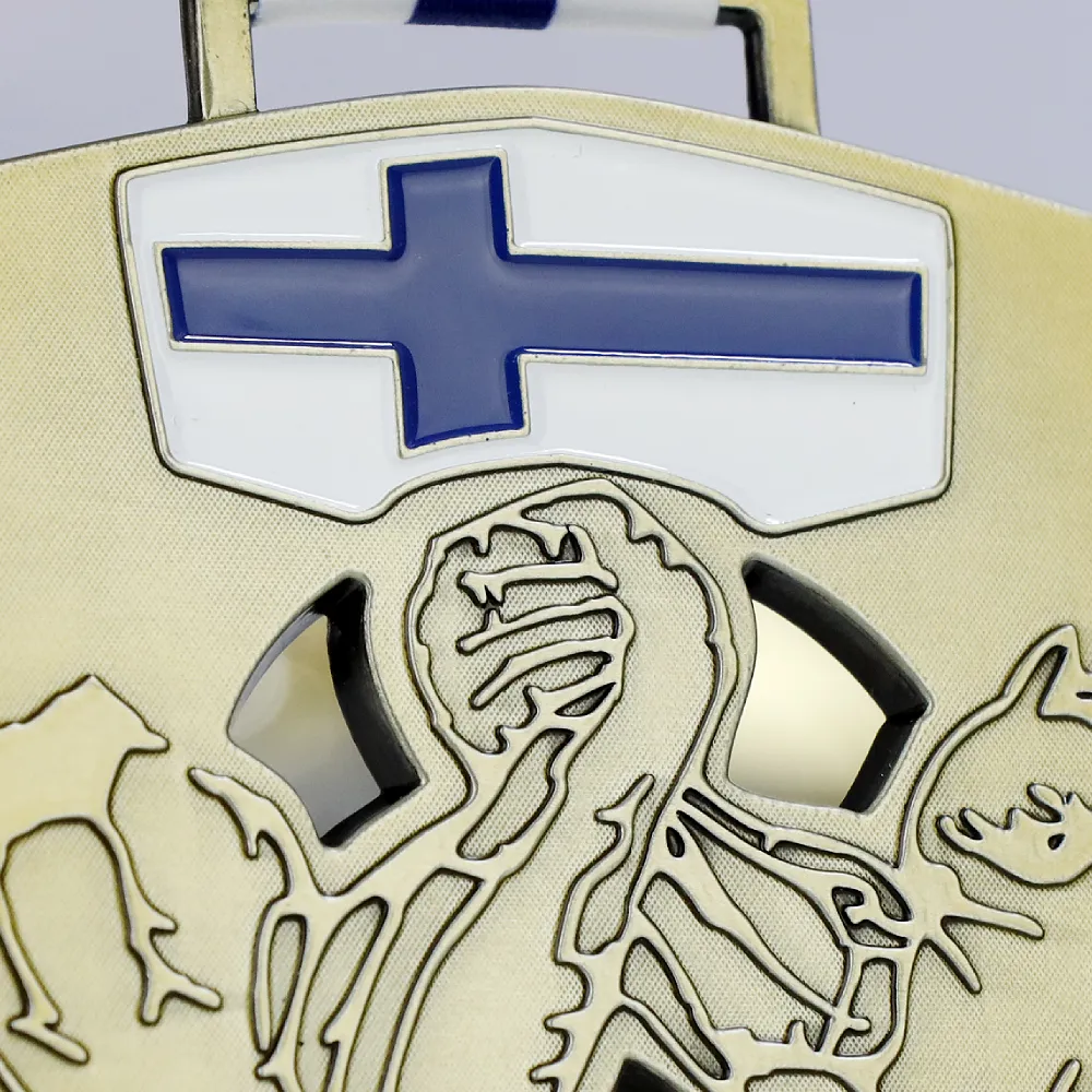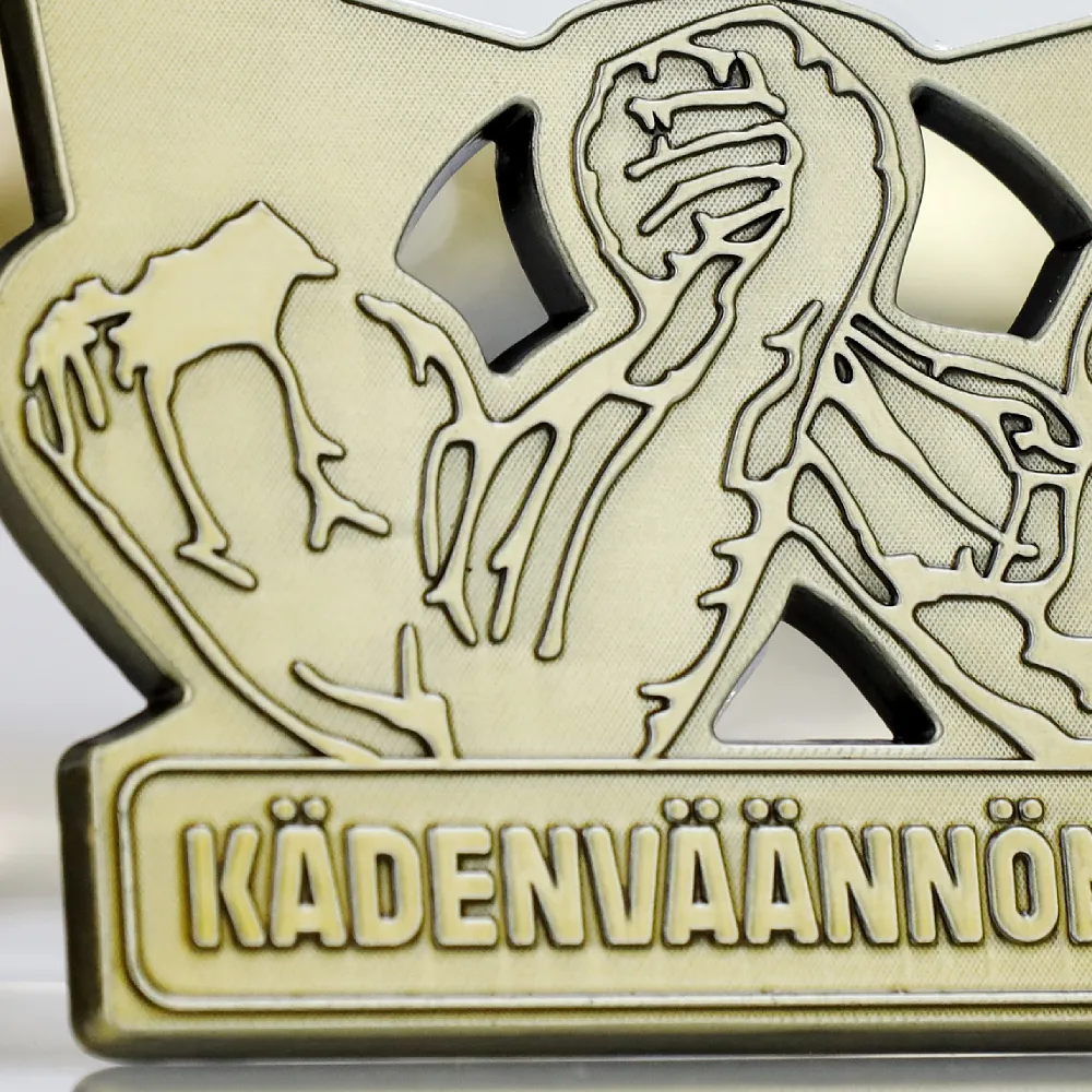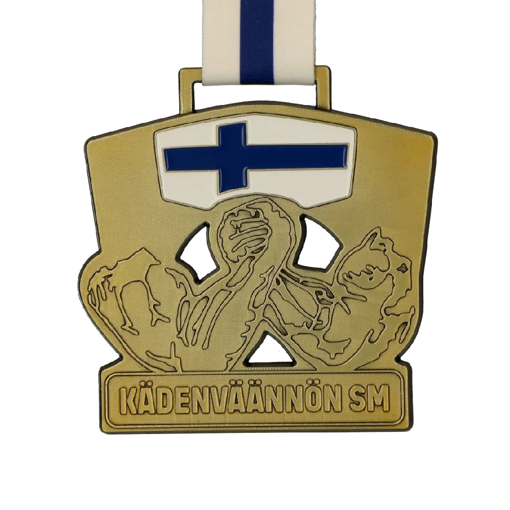Una medaglia pressofusa progettata per Kädenväännön SM – i Campionati Finlandesi di Braccio di Ferro. La medaglia ha un colore oro con un motivo fuso che raffigura le lotte dei concorrenti. In alto, c'è una bandiera finlandese, enfatizzando il carattere nazionale dell'evento. Il nome del torneo è chiaramente scritto sul bordo inferiore. La medaglia è appesa a un nastro bianco con una striscia blu, facendo riferimento ai colori nazionali della Finlandia.