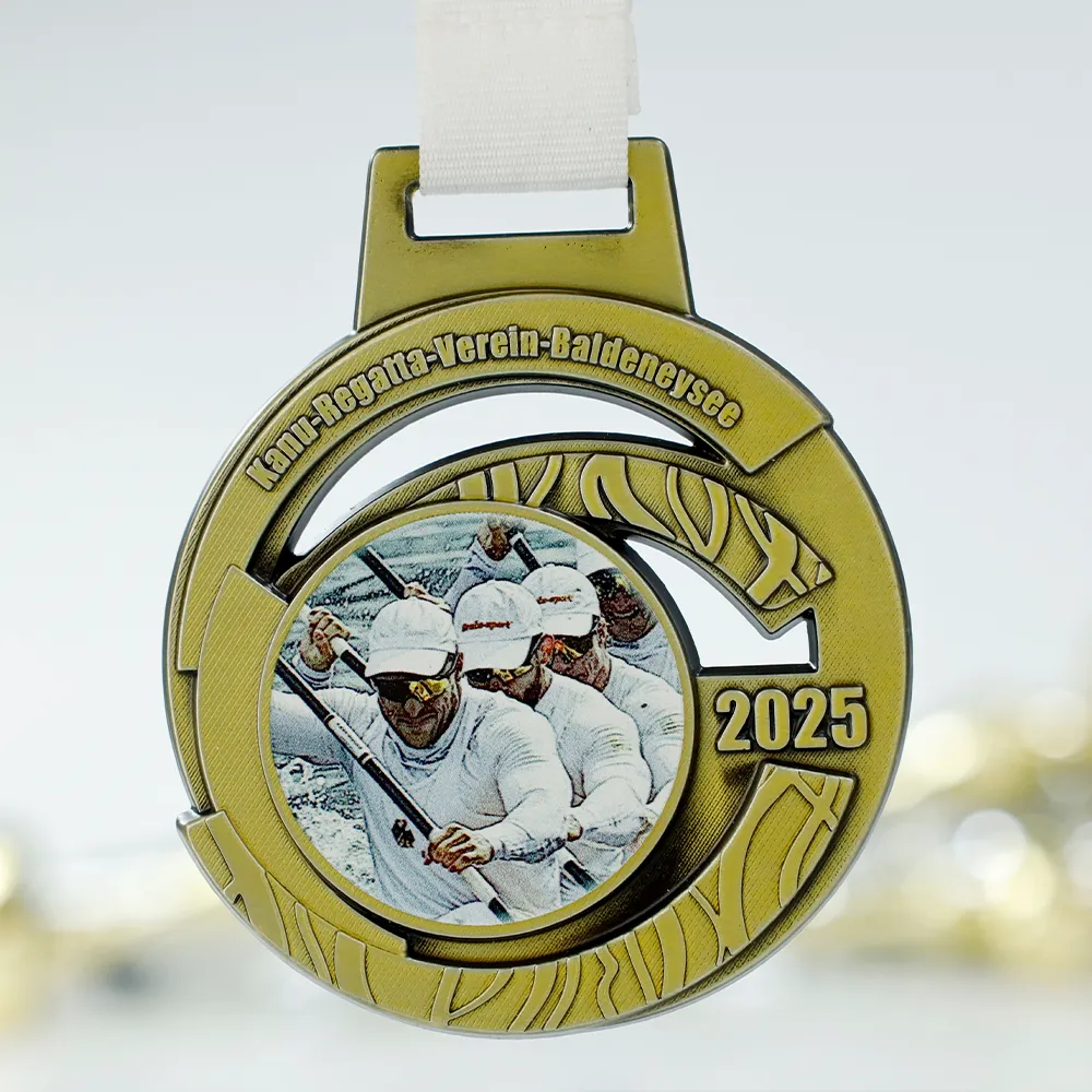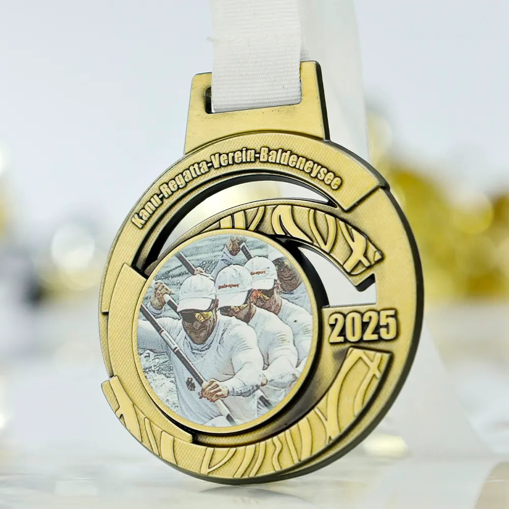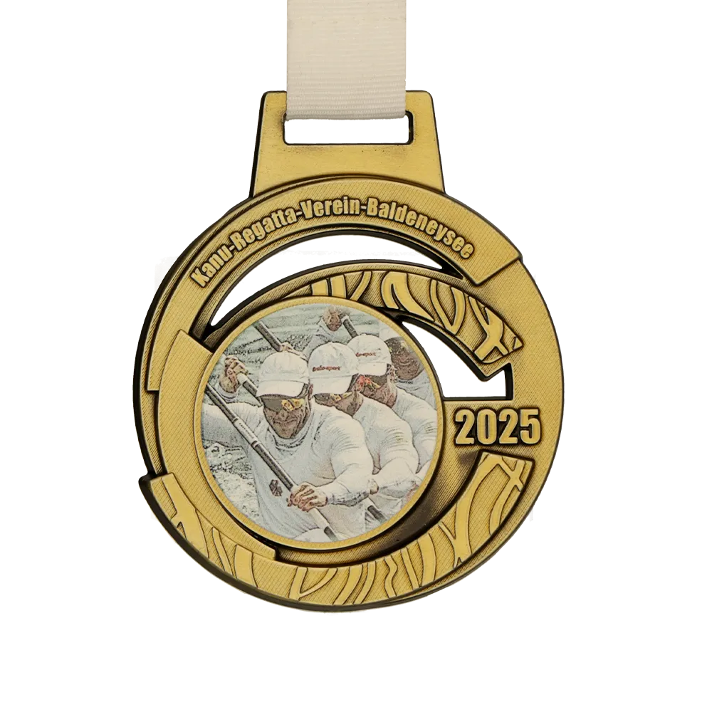 Questa medaglia personalizzata è stata progettata per Kanu-Regatta-Verein Baldeneysee nel 2025. È una medaglia in fusione stampata realizzata per una regata professionale di canoa. La medaglia è fusa con una finitura in oro opaco e presenta dettagli geometrici ritagliati. La stampa UV a colori posizionata centralmente mostra un'immagine dinamica di un equipaggio di quattro persone in barca a remi.