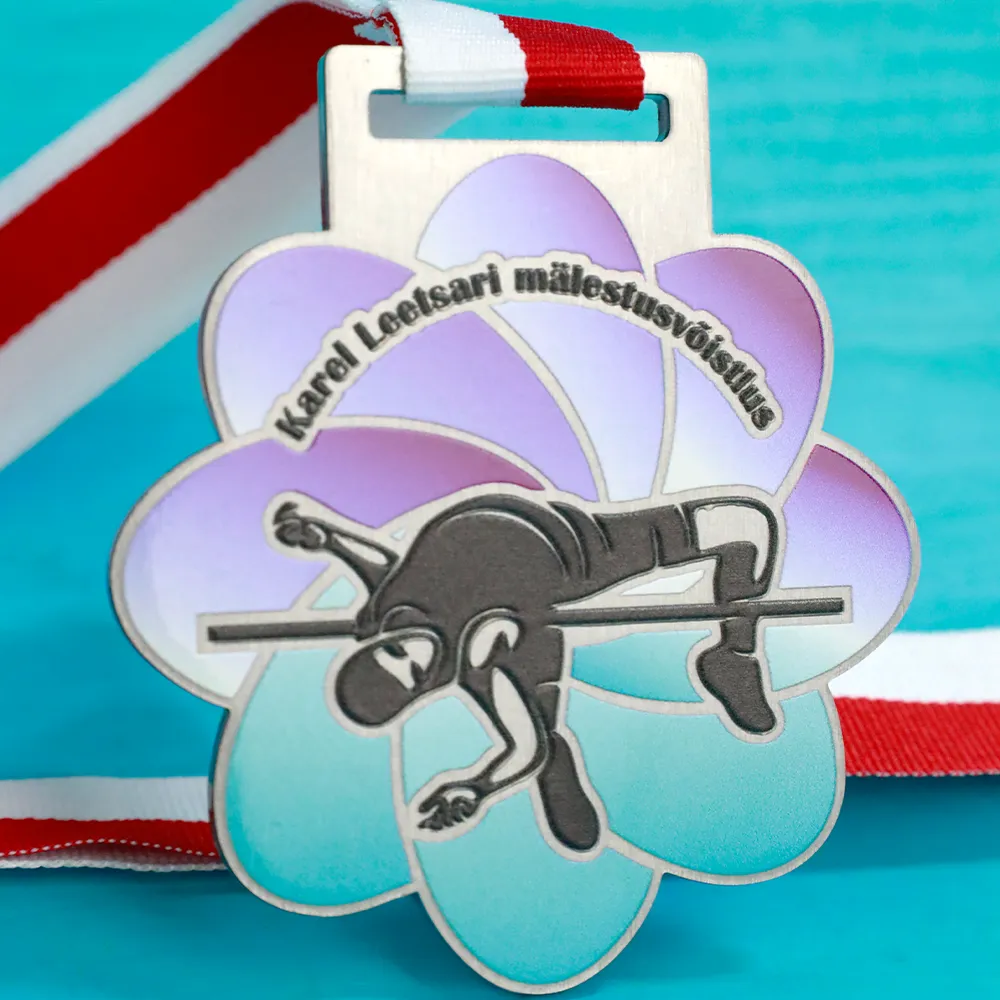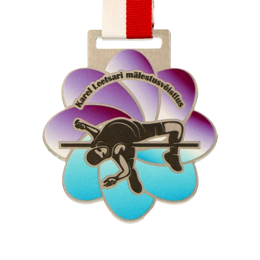Una medaglia su misura per il Karel Leetsari mälestusvõistlus. Una medaglia a forma di fiore con una silhouette stampata di un atleta a metà salto, che riflette il dinamismo e la passione per lo sport.