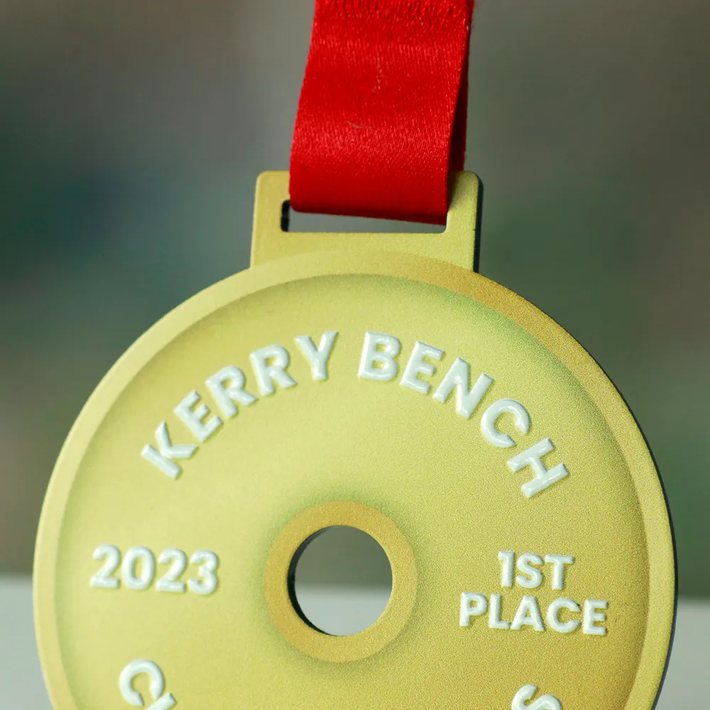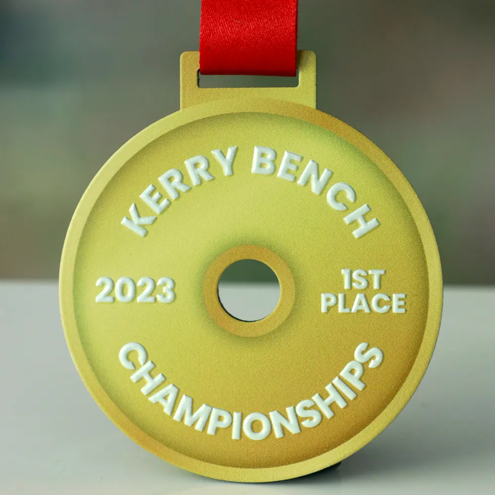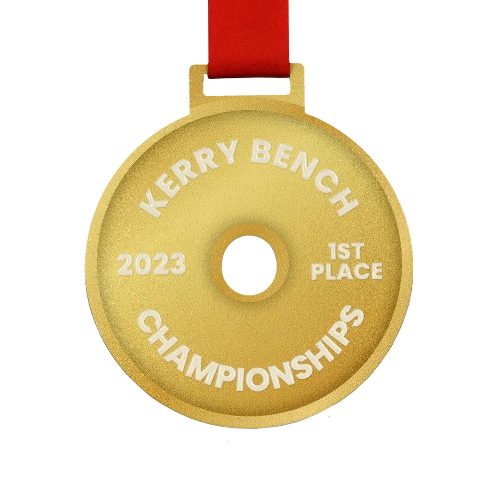 Una medaglia su misura per i Campionati di Bench-Press di Kerry. Un design semplice ma sorprendente con testo grande e chiaro stampato utilizzando la tecnologia UV.
