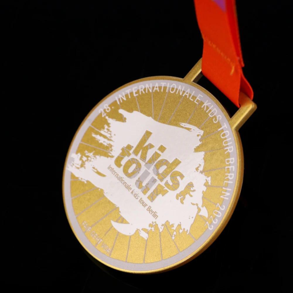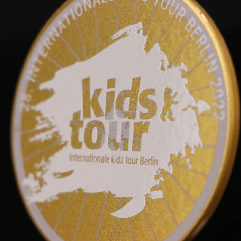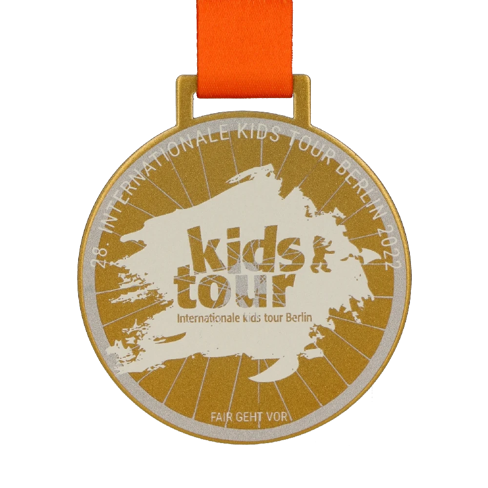 Anche un design classico può catturare l’immaginazione. L’organizzatore del Kids Tour Berlin è perfettamente consapevole di questo fatto, poiché abbiamo progettato per loro un’originale medaglia in acciaio stampato nella classica forma rotonda. Il suo design color oro è variato con una stampa colorata. Inoltre i suoi colori vivaci abbinati si fondono perfettamente con il design generale e la vernice applicata li fa brillare brillantemente alla luce. La medaglia cattura l’occhio con le sue numerose decorazioni simmetriche sotto forma di linee stampate. Si incontrano al centro fornendo uno sfondo perfetto per il nome stampato dell’evento ciclistico durante il quale è stata assegnata la medaglia.