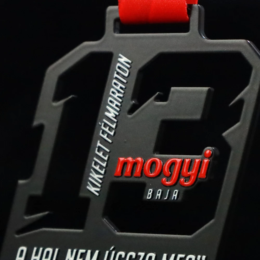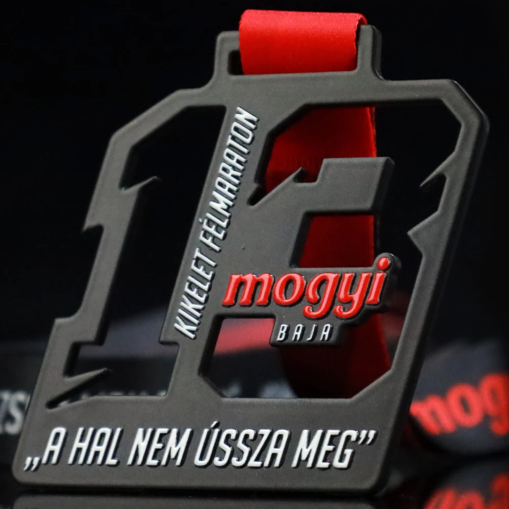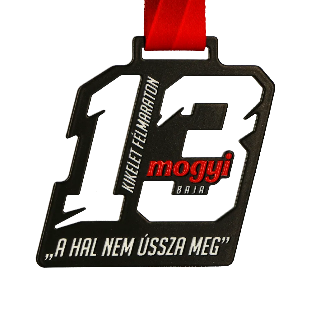 La Kikelet Felmarathon Baja è una gara a cui partecipano atleti di molte regioni del mondo. La competizione è organizzata da tredici anni e con ogni edizione ci sono sempre più partecipanti. Di conseguenza l’organizzatore ha deciso di premiarli con premi insoliti. Queste erano le nostre medaglie in acciaio stampato che abbiamo tagliato con un laser di precisione. Grazie ad esso siamo riusciti ad ottenere una forma insolita che abbiamo variato con un traforo a forma del numero tredici. Inoltre sulla superficie della medaglia ci sono iscrizioni tridimensionali che abbiamo realizzato con la stampa a colori. Tutto questo è coronato da un nastro personalizzato che si abbina perfettamente al design del premio.
