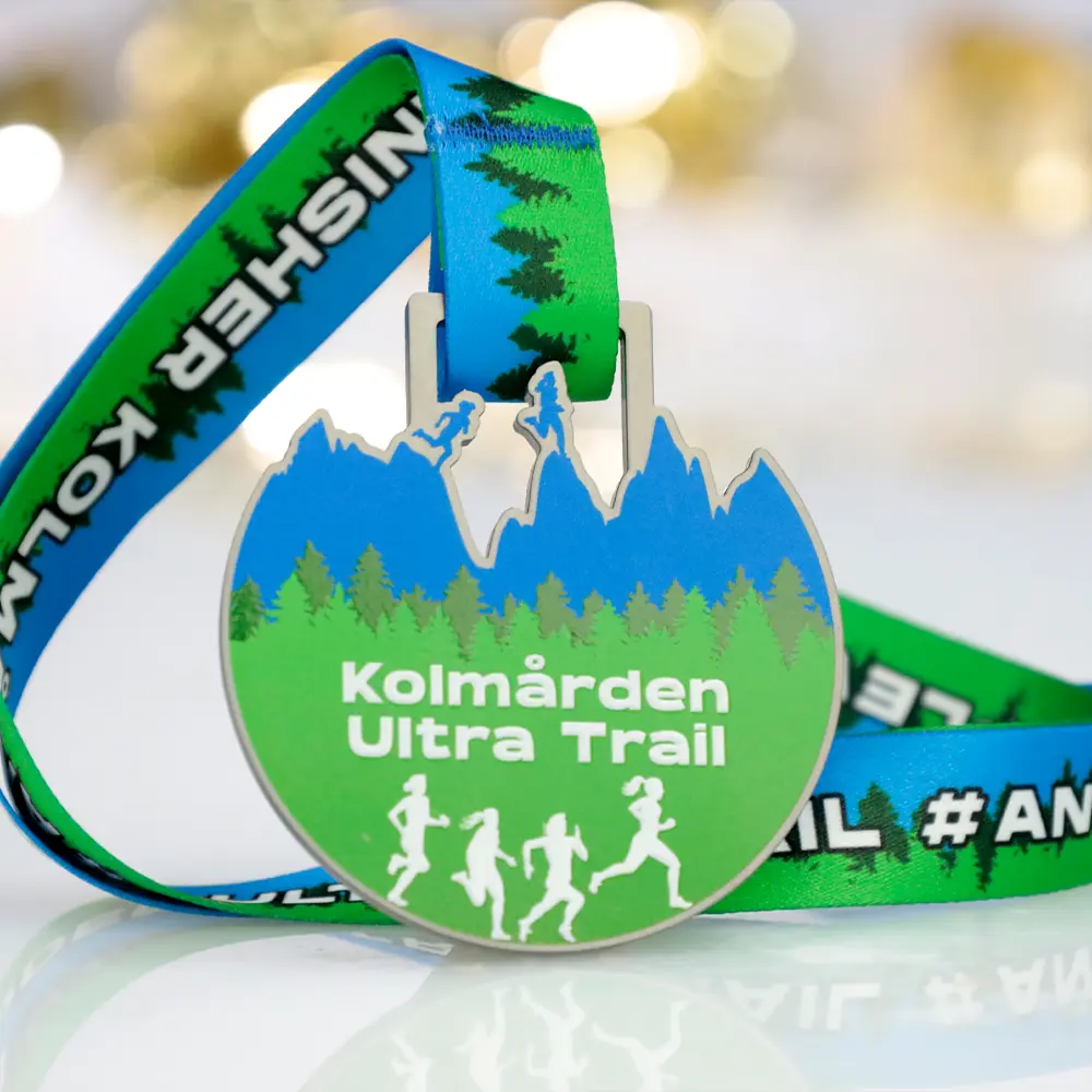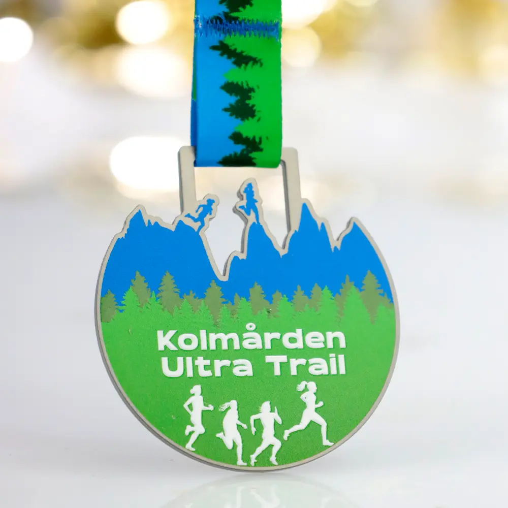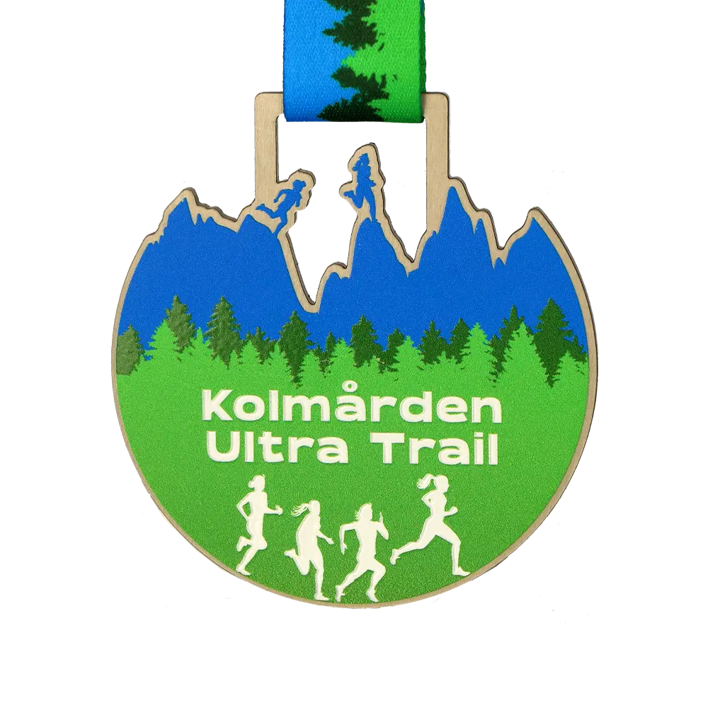 La medaglia da corsa personalizzata progettata per il Kolmården Ultra Trail mostra corridori su un paesaggio montuoso. La forma unica della medaglia riflette il terreno del percorso di gara, che passa attraverso le pittoresche aree boschive di Kolmården.