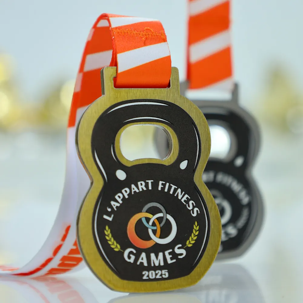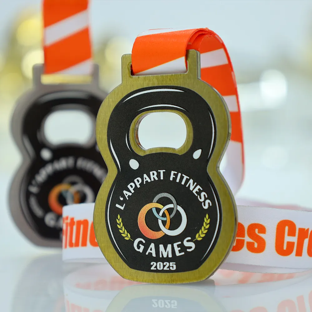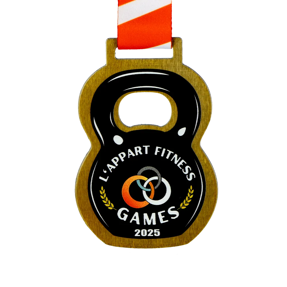 Medaglie su misura progettate per l'evento L'Appart Fitness Games 2025. È una medaglia in metallo con una forma distintiva a kettlebell realizzata utilizzando il taglio laser. La parte anteriore presenta una grafica vivace che raffigura un kettlebell, anelli intrecciati, il nome dell'evento e l'anno. Tutte le decorazioni e gli elementi grafici sono ottenuti attraverso una stampa UV durevole.