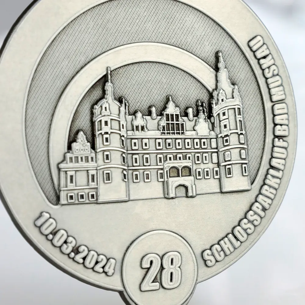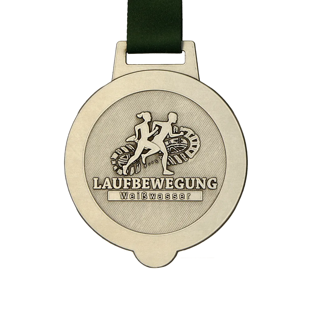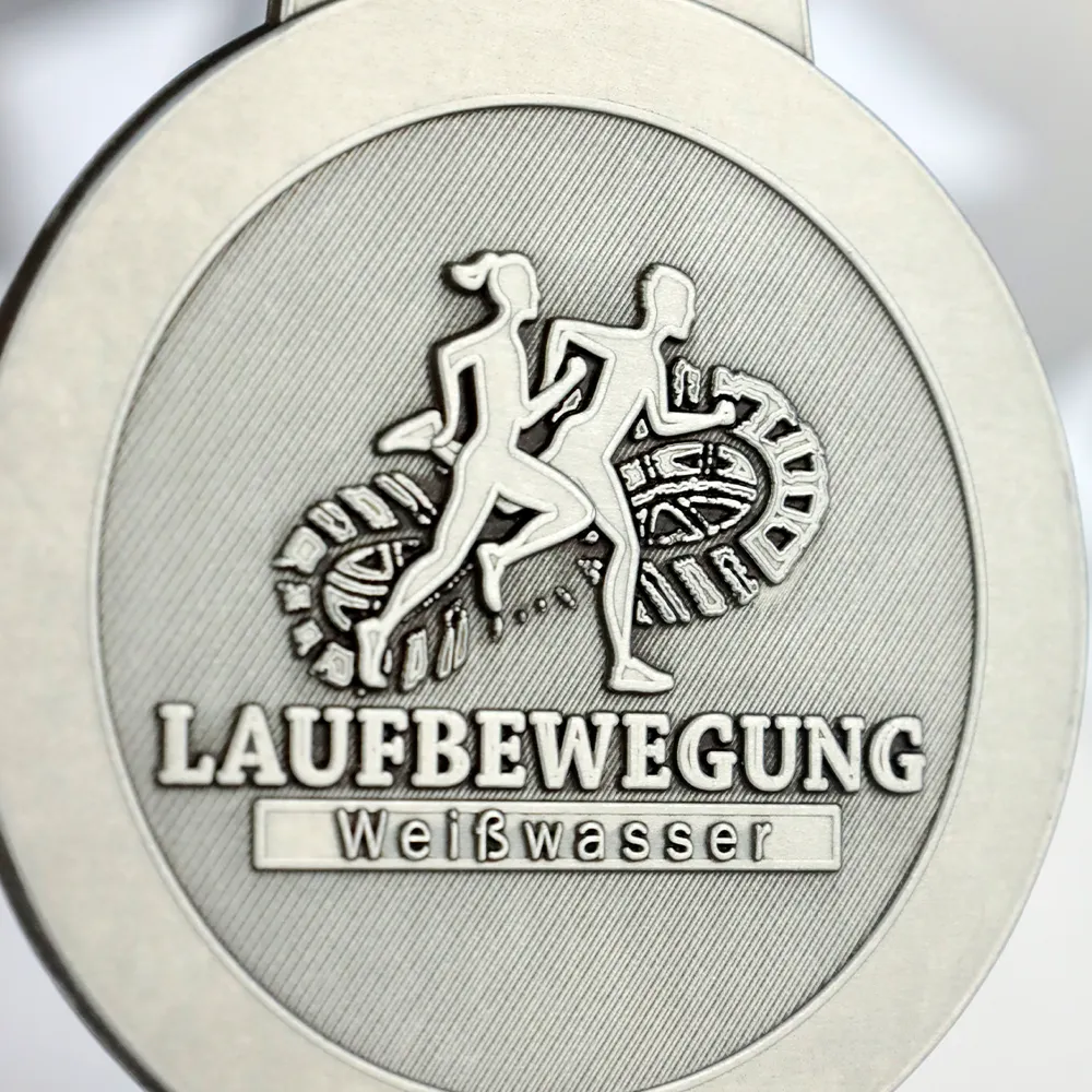 La medaglia da corsa per i partecipanti all'evento Laufbewegung Weißwasser è stata progettata pensando ai corridori. La medaglia presenta due figure che corrono e un motivo di impronta di scarpa, a simboleggiare il movimento e il dinamismo della competizione. È una medaglia pressofusa, che consente dettagli eccezionali e le conferisce una forma originale. Il design complessivo crea un ricordo semplice ma elegante per ogni partecipante.