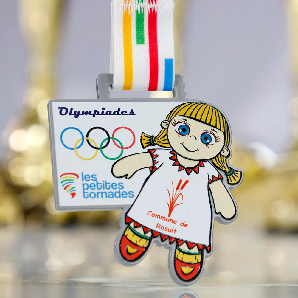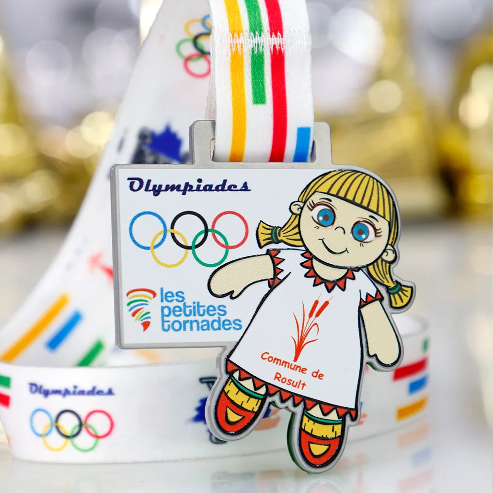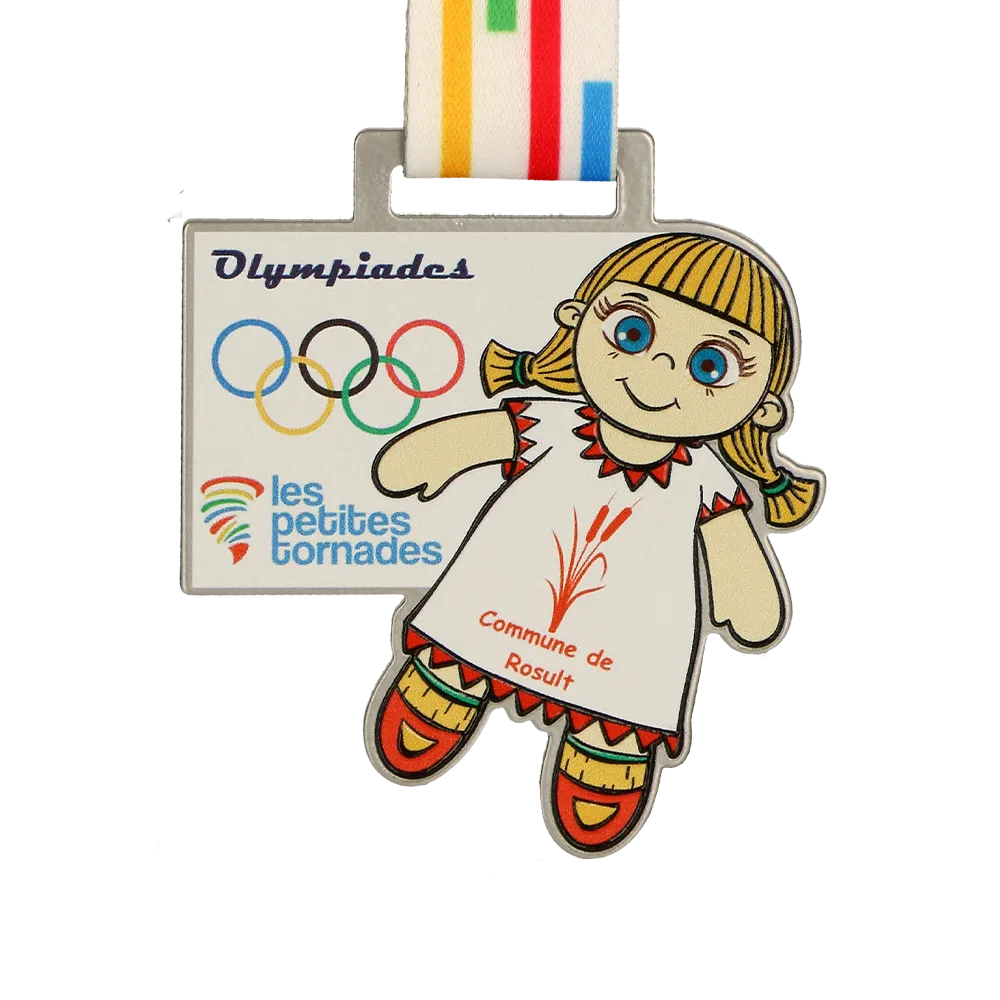 Design di medaglia per l'evento sportivo per bambini "Olympiades – les petites tornades". La medaglia presenta un divertente personaggio di una ragazza e simboli olimpici in stampa UV colorata. La personalizzazione include il nome e la località dell'evento. È incluso un nastro colorato con motivi abbinati.