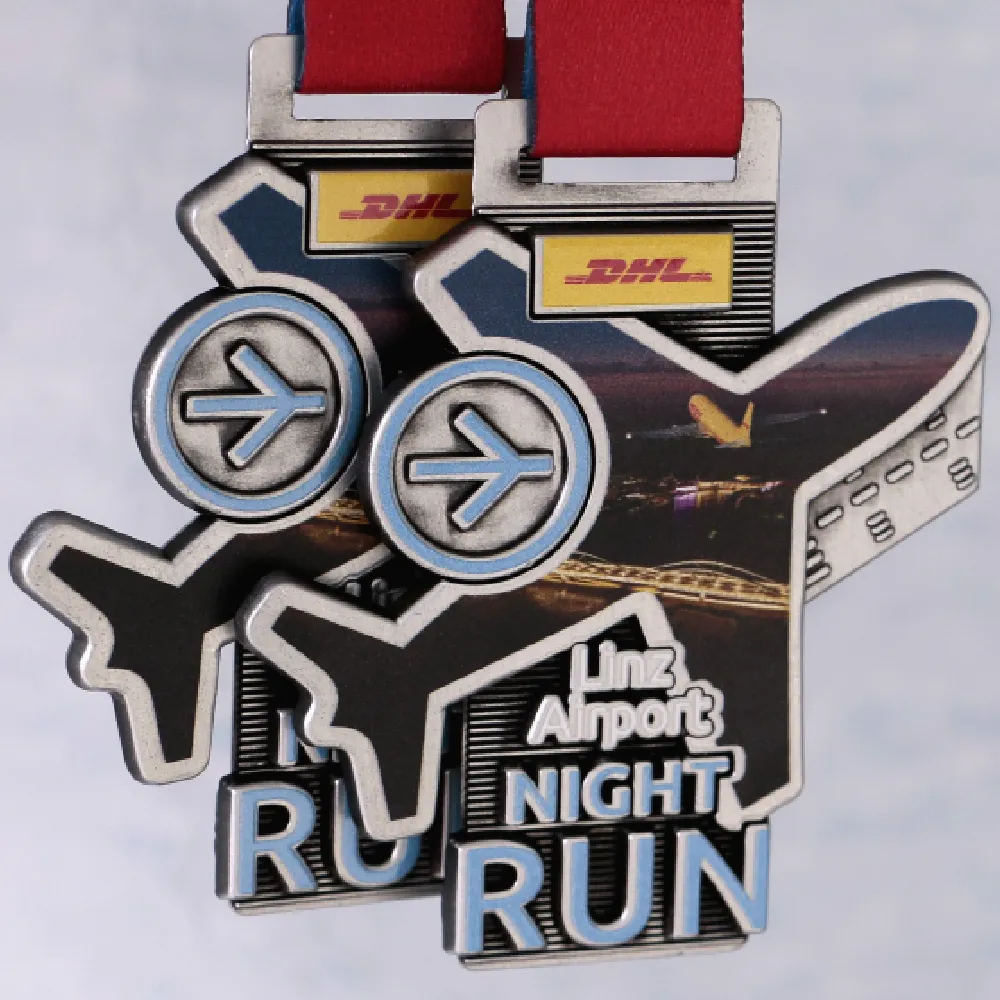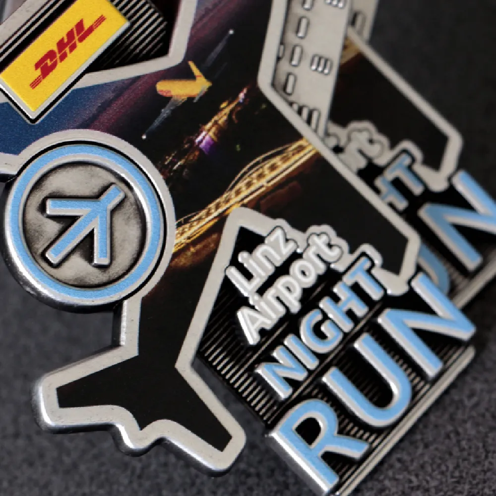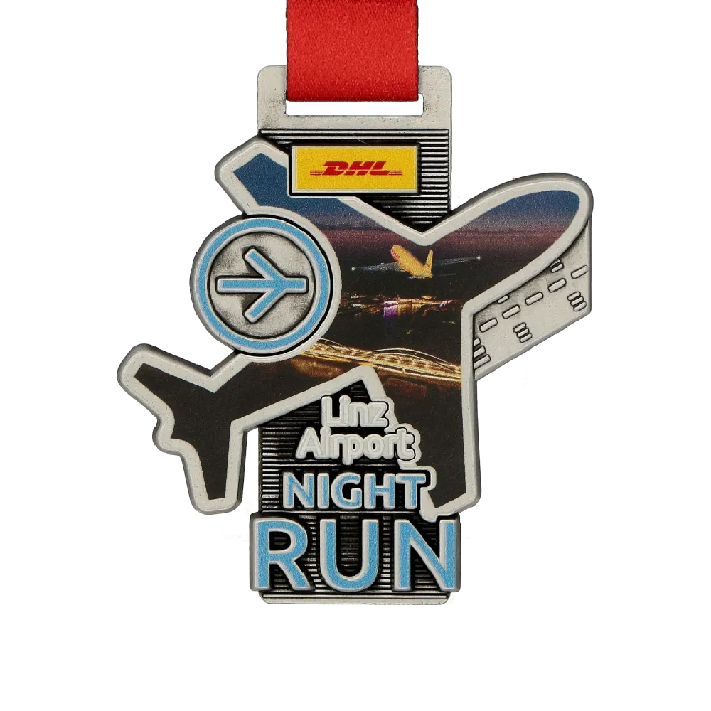 Medaglie a forma di aeroplano? Non è un problema per noi. Questa volta il nostro progetto insolito è andato agli organizzatori della corsa notturna all’aeroporto di Linz. Le corse notturne hanno la loro atmosfera unica. Pertanto anche le medaglie da corsa assegnate durante esse dovrebbero distinguersi. Per questo motivo WinMed ha creato moderne medaglie in fusione con una stampa colorata sulla sua superficie. Le medaglie che abbiamo preparato per la Linz Airport Night Run hanno una forma originale che abbiamo ottenuto grazie alla matrice in acciaio precedentemente preparata. Inoltre queste solide medaglie su misura hanno molte decorazioni tridimensionali su di esse. Il tutto è coperto da una stampa colorata che aggiunge carattere alla medaglia.