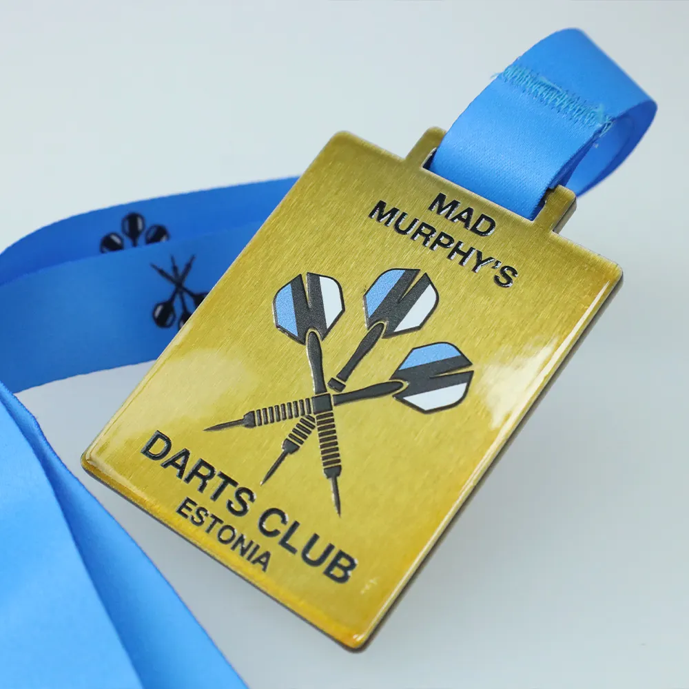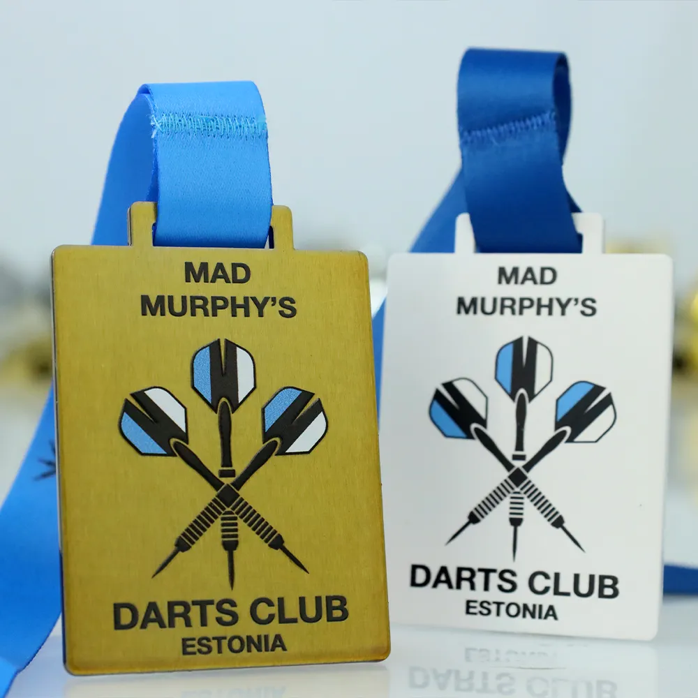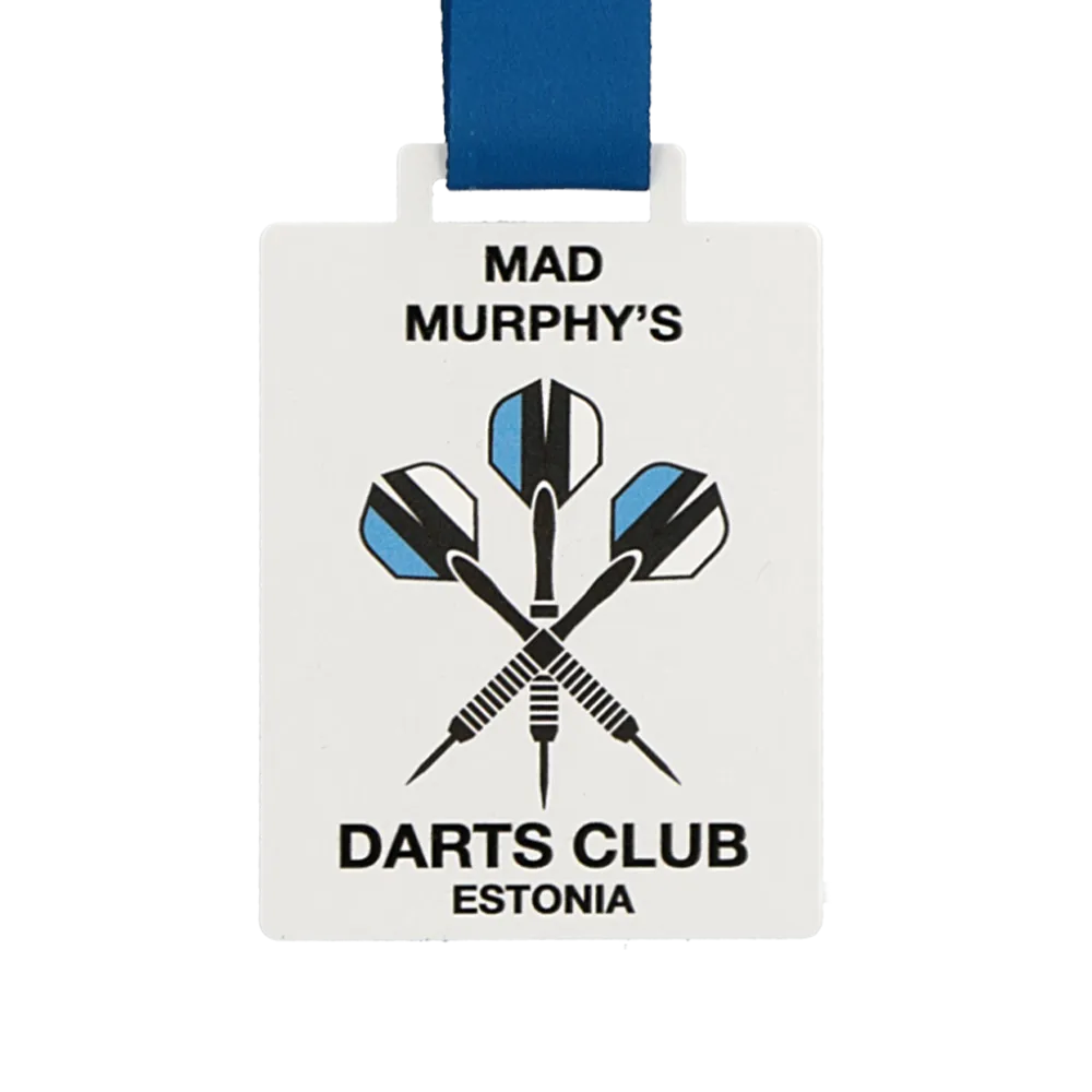 Rettangolare medaglia su misura prodotta per il club estone Mad Murphy's Darts Club, realizzata in acciaio con superficie bianca. Tre freccette incrociate con alette blu e nere occupano il centro della composizione. Il nome del club e il paese sono divisi su due righe di testo — una sopra e una sotto l'opera d'arte.