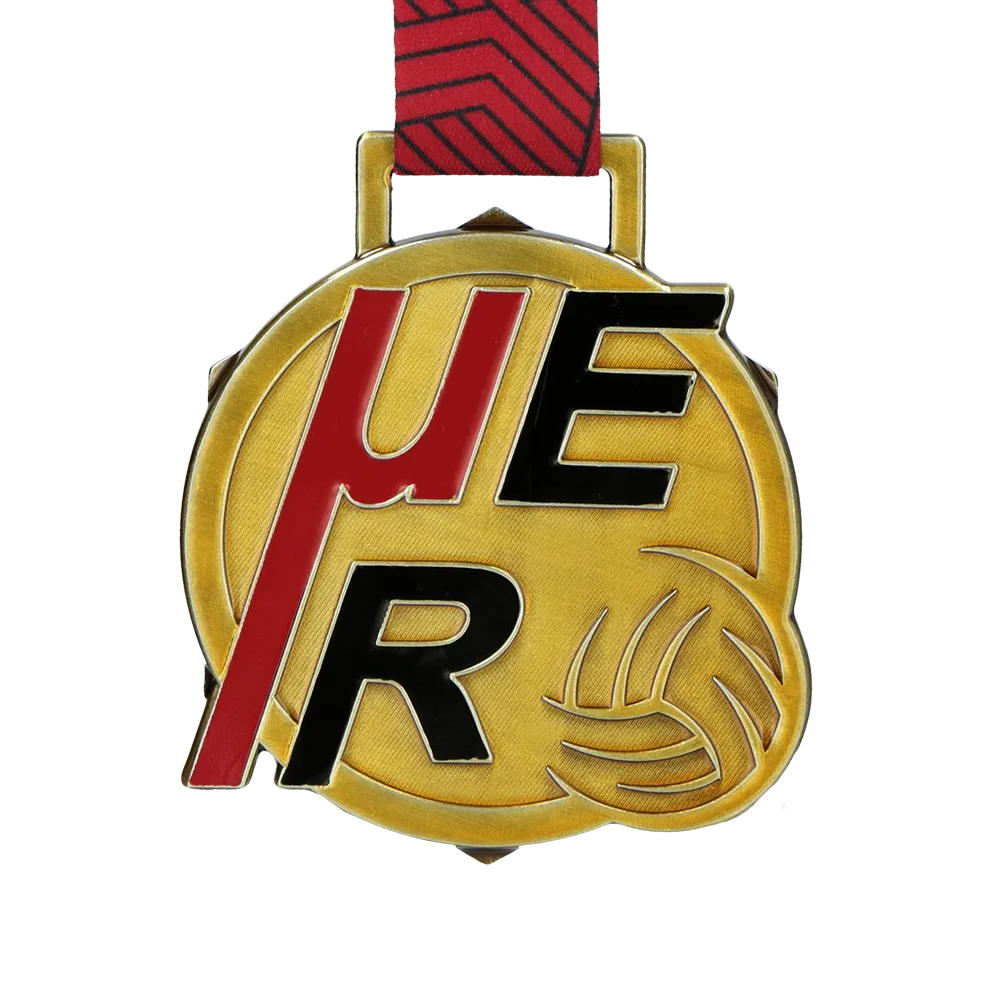 Medaglia commemorativa del torneo MAFC 2025, pressofusa in lega di zinco con finitura oro anticato. La caratteristica dominante è la grande scritta UER — in rosso e nero — riempita con smalto colorato e che si estende oltre il contorno circolare. Una palla da pallavolo si trova nell'angolo in basso a destra. Nastro rosso con motivo a spina di pesce nero.