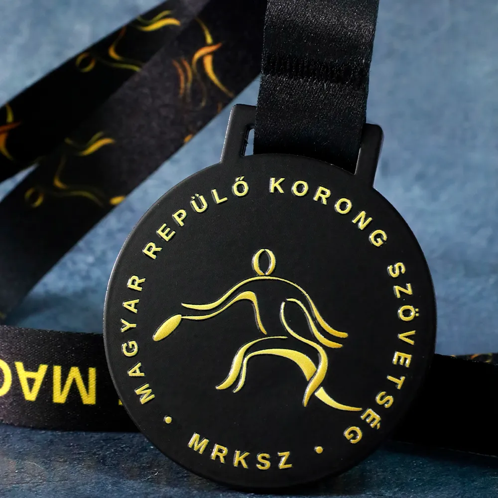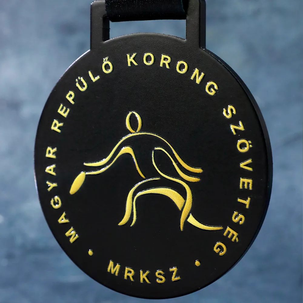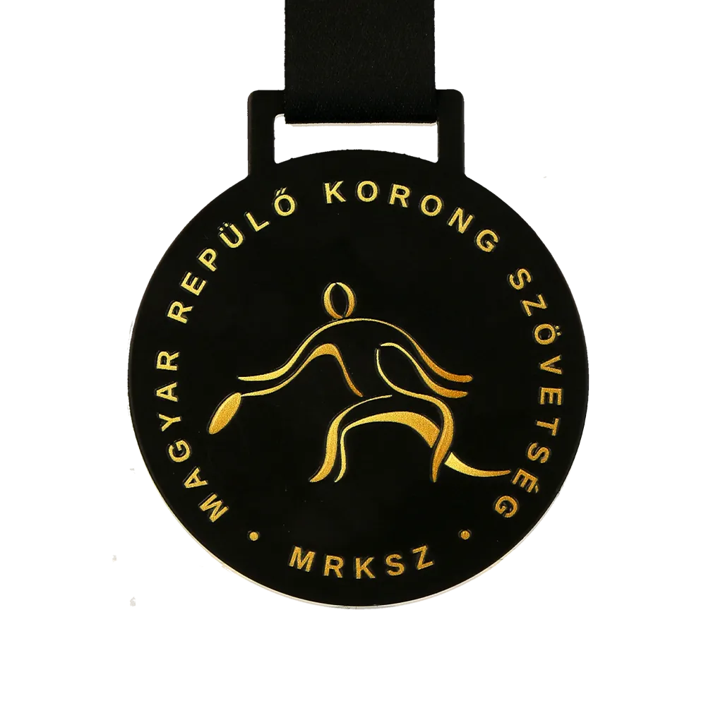 Magyar Repülő Korong Szövetség è una federazione sportiva dedicata alla promozione degli sport con disco come l’ultimate frisbee tra gli ungheresi. L’organizzazione mira a sviluppare questa disciplina a tutti i livelli dal ricreativo al professionale. La federazione si concentra anche sulla formazione degli allenatori e sulla coltivazione dei talenti dei giovani atleti. Su richiesta della federazione abbiamo creato una Medaglia Su Misura per le competizioni che organizzano. Questa medaglia è rotonda con uno sfondo nero ed elementi dorati. Al centro c’è un’immagine dorata di una persona che lancia un frisbee. Il testo attorno al bordo superiore e in basso è realizzato utilizzando una stampa UV durevole. La medaglia è rifinita con un nastro nero con il logo della federazione. Il design è semplice ma chiaro adattandosi perfettamente alla natura dello sport che rappresenta.