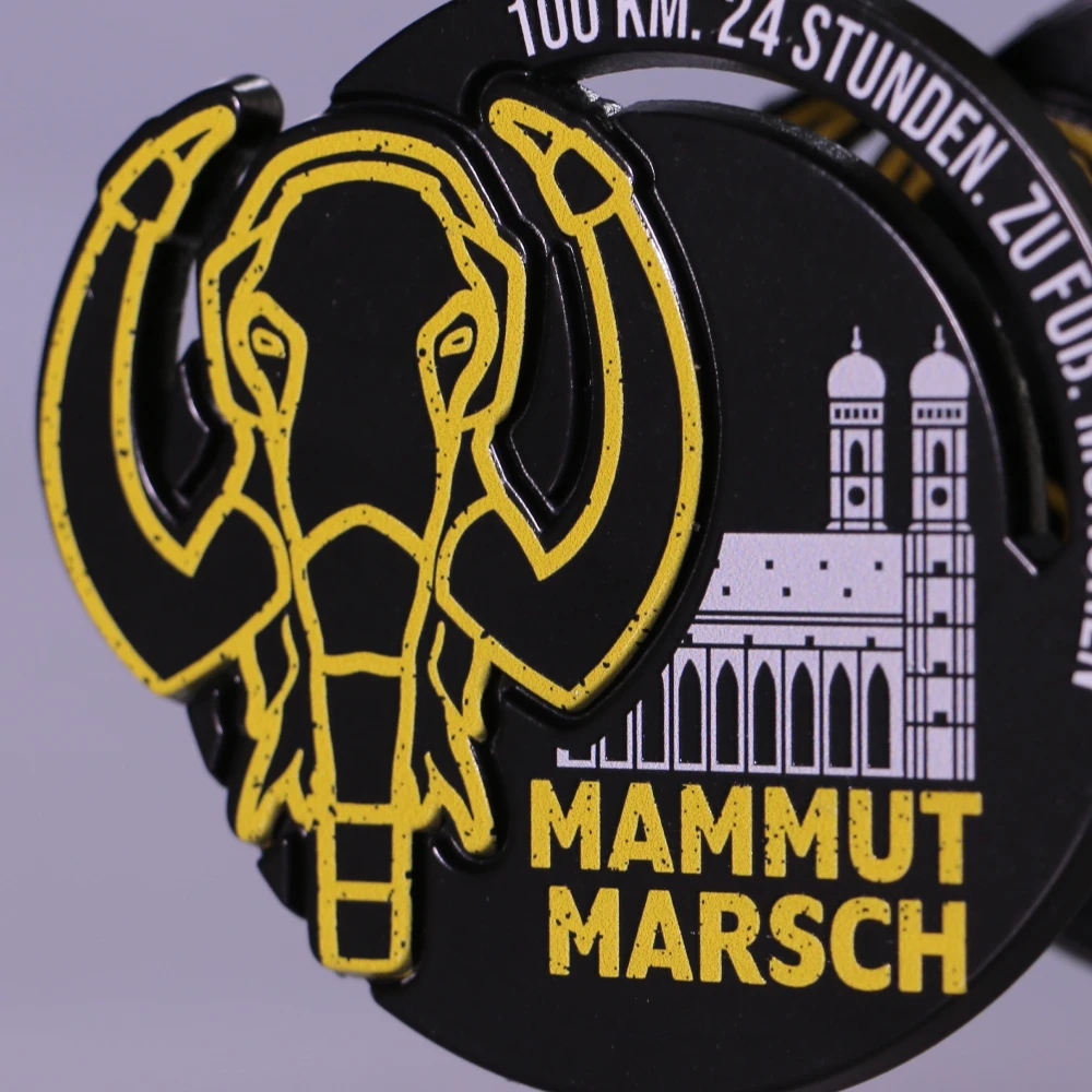 Le medaglie sportive sono state preparate per la Mammutmarsch München, caratterizzate da una copertura con stampa UV colorata che risalta con una decorazione dorata a forma di testa di mammut.