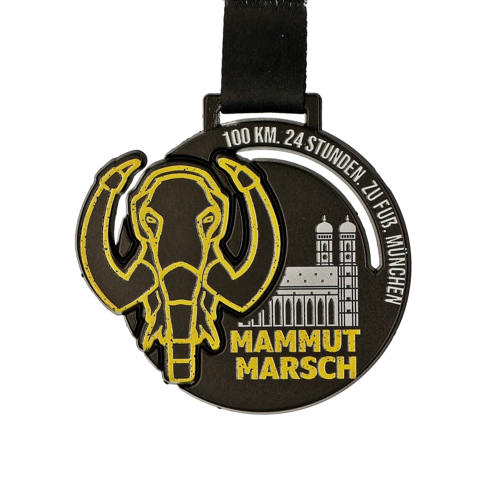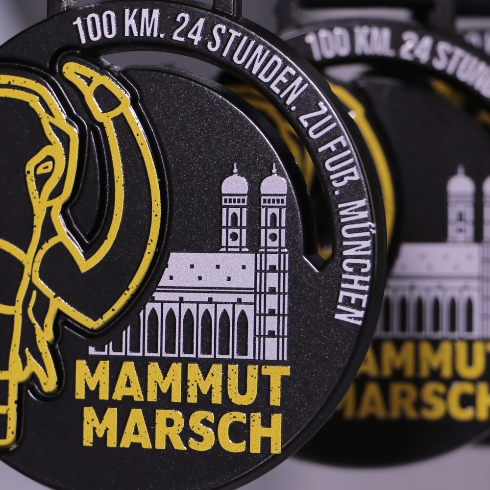 Mammutmarsch è un evento unico per gli amanti della marcia estrema. I partecipanti possono scegliere tra varie distanze: 30 km, 55 km e la distanza più impegnativa di 100 km che deve essere completata entro 24 ore. Questo evento non è solo una prova di resistenza fisica ma anche una sfida mentale. Gli eventi Mammutmarsch sono organizzati in diverse città come Monaco, dove i partecipanti hanno l’opportunità di scoprire la città da una prospettiva completamente diversa. I percorsi sono progettati in modo che i partecipanti possano sperimentare sia le attrazioni urbane che la bellezza della natura. Ogni evento è unico e offre il proprio set di sfide e panorami. Su richiesta degli organizzatori abbiamo realizzato per loro bellissime medaglie sportive che si distinguono con un design originale. Hanno un colore nero su cui abbiamo applicato una stampa UV multicolore. Evidenzia perfettamente la decorazione più importante, la grafica dorata di una testa di mammut, dando carattere all’insieme e adattandosi perfettamente all’atmosfera dell’evento. Inoltre, abbiamo incluso nastri a sublimazione con i premi, che abbiamo anche progettato specificamente per l’occasione. Tutto questo per garantire che le medaglie da corsa formino un insieme perfettamente abbinato.