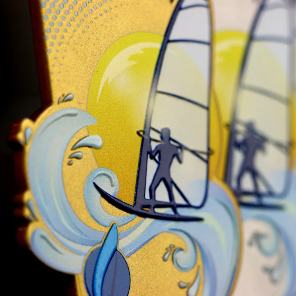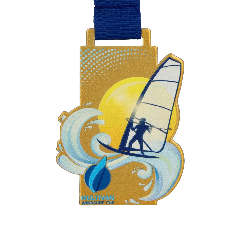 In quasi ogni evento sportivo vengono selezionati tre migliori atleti per salire sul podio. Ognuno di loro dovrebbe essere premiato e riconosciuto di conseguenza. Pertanto vengono utilizzati abitualmente tre colori di medaglia: oro, argento e bronzo. Abbiamo realizzato moderne medaglie in acciaio in queste versioni di colore per premiare i partecipanti all’evento Multivan Windsurf Cup. Abbiamo adattato la loro forma al tema adottato dall’organizzatore. รˆ stato ottenuto con una stampa colorata lucida. Inoltre gli abbellimenti a forma di onda e atleta sono stati sollevati per essere rilevabili sotto le dita.