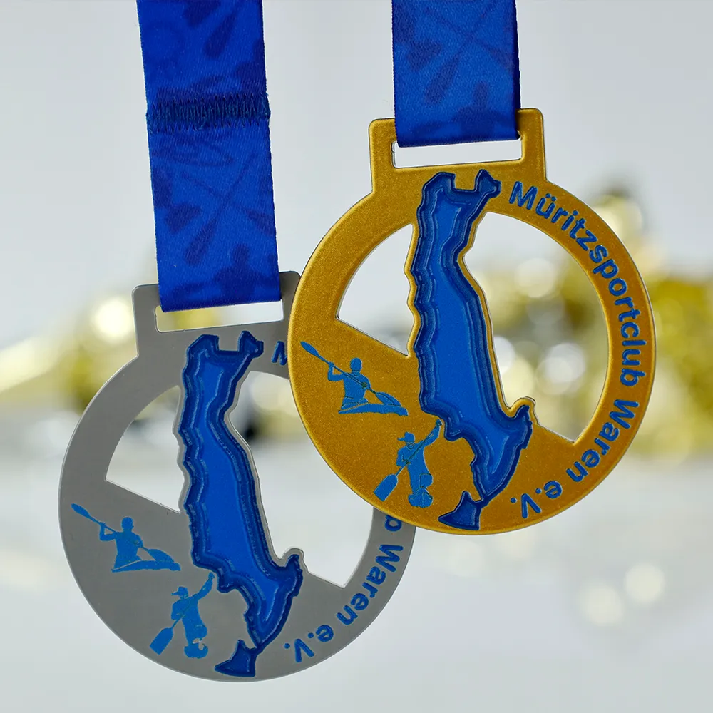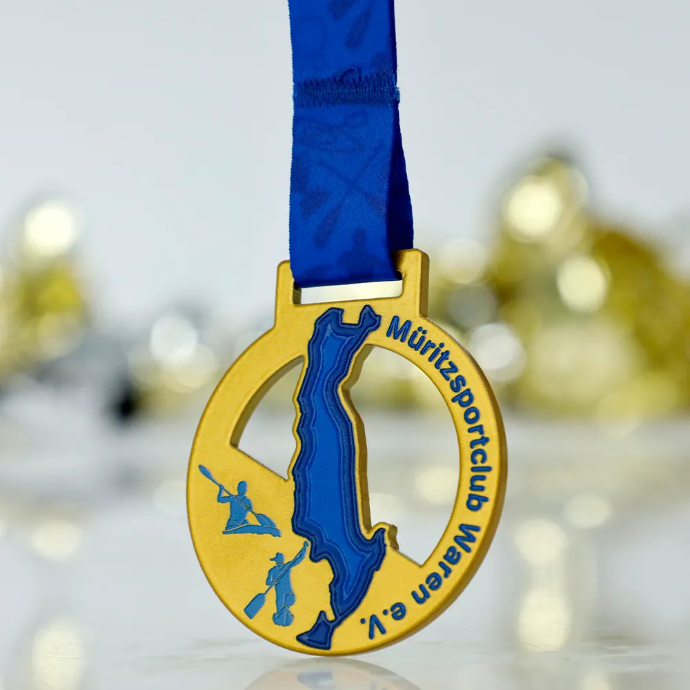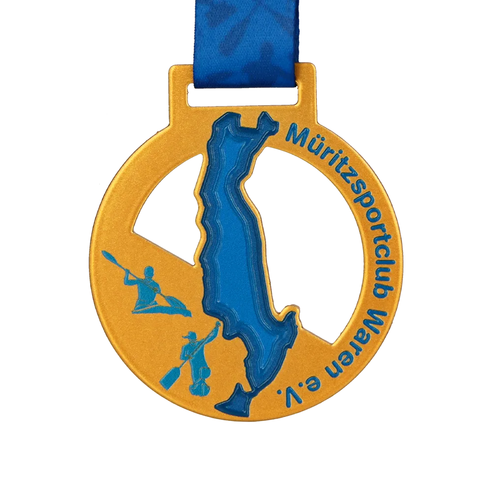 Medaglia personalizzata circolare con un design centrale di una mappa del lago blu. Presenta atleti in kayak e il nome del club sportivo. Medaglia in acciaio con stampa UV e dettagli colorati. La personalizzazione include il nome dell'evento e grafiche sportive.