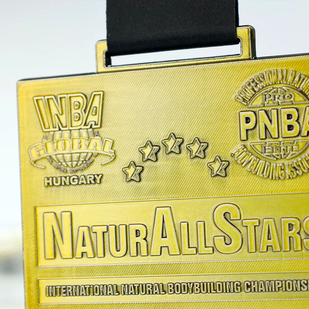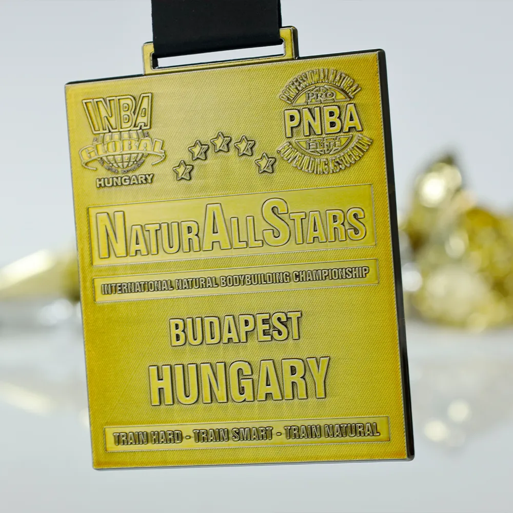 Questa medaglia pressofusa è stata prodotta per il Natural Allstars International Natural Bodybuilding Championship a Budapest, Ungheria. Ha un formato rettangolare e una finitura in oro opaco. Realizzata per una competizione di bodybuilding, puoi trovare altri design simili nella nostra categoria medaglie per sport di forza.