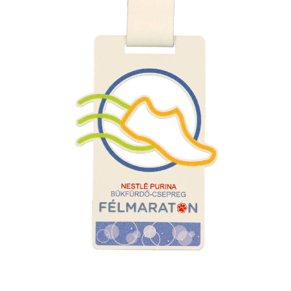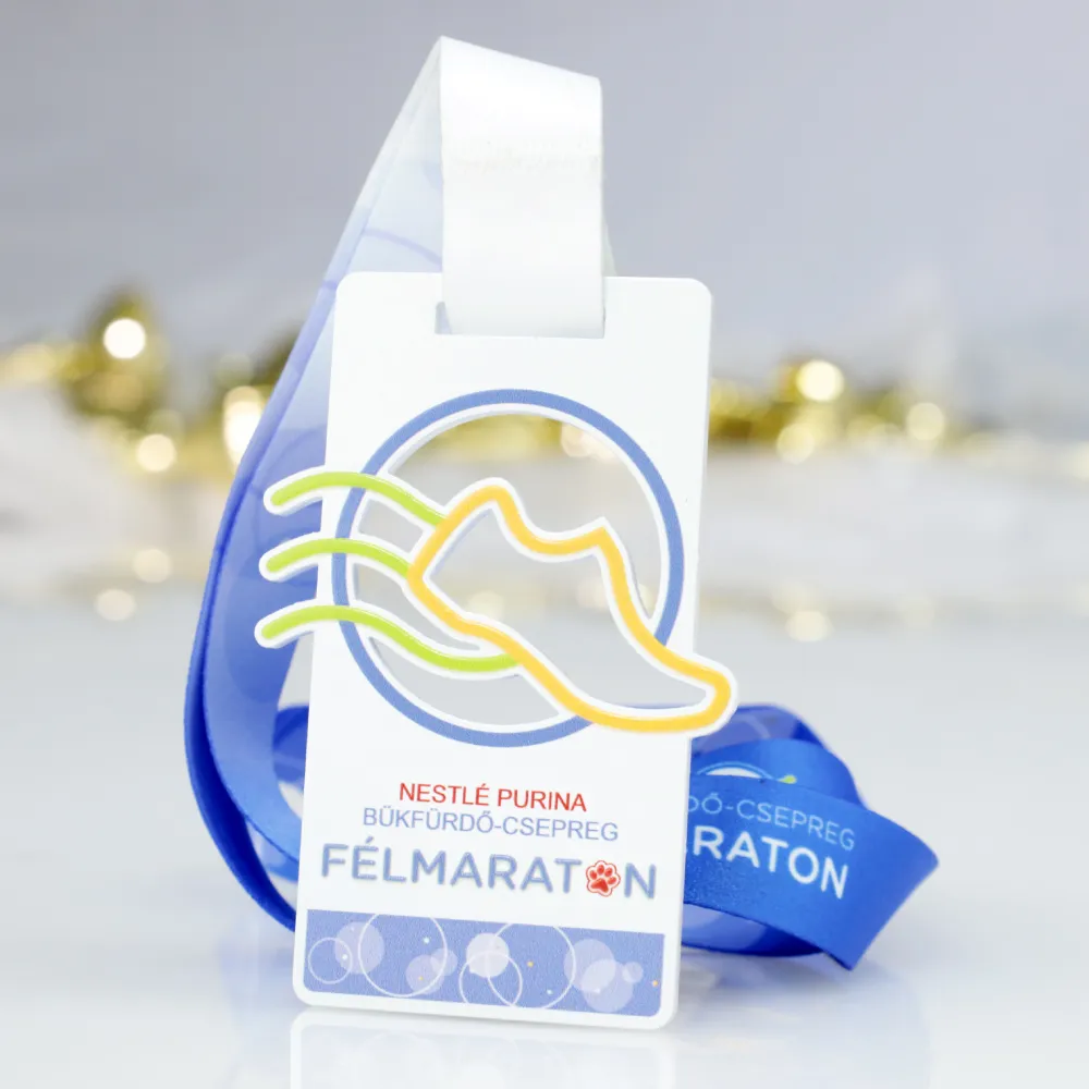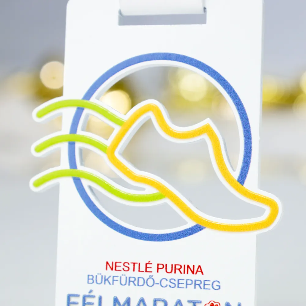 Una medaglia da corsa rettangolare creata per l'evento 'Nestlé Purina Félmaraton Bükfürdő-Csepreg'. La parte anteriore presenta una grafica colorata di una silhouette di scarpa da corsa contro uno sfondo circolare, insieme ai loghi degli sponsor. Lo sfondo chiaro e il design minimalista enfatizzano l'atmosfera moderna del premio, rendendola ideale per mezze maratone ed eventi che promuovono l'attività fisica.
