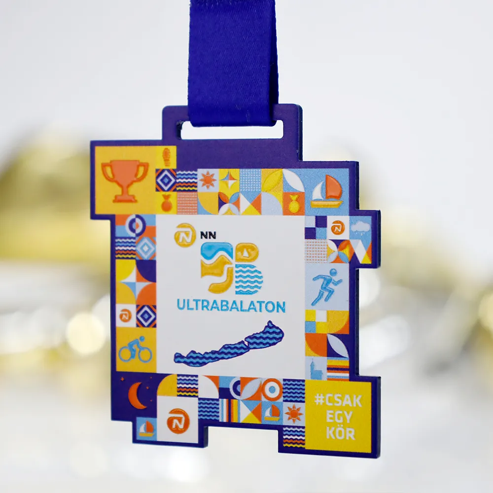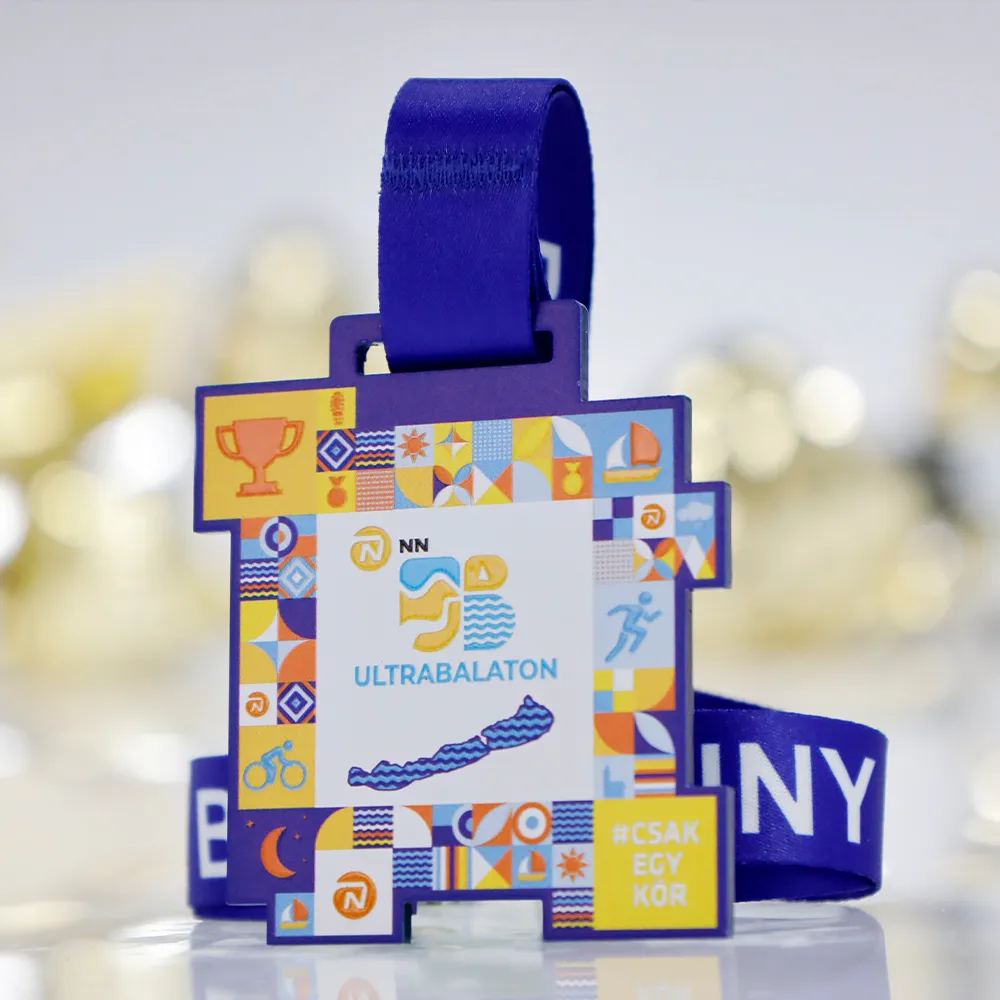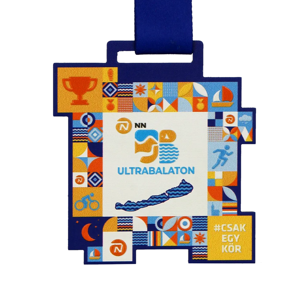 Medaglia personalizzata creata per l'evento NN Ultrabalaton. È una medaglia in metallo. La parte anteriore presenta il logo dell'evento, un contorno del Lago Balaton e numerosi simboli colorati relativi allo sport e alla regione, tutti applicati utilizzando la stampa UV.