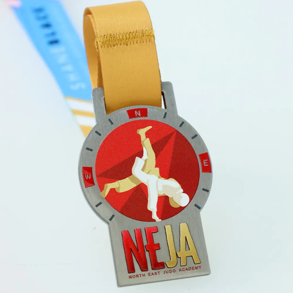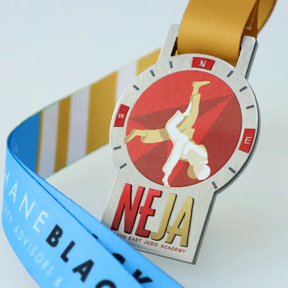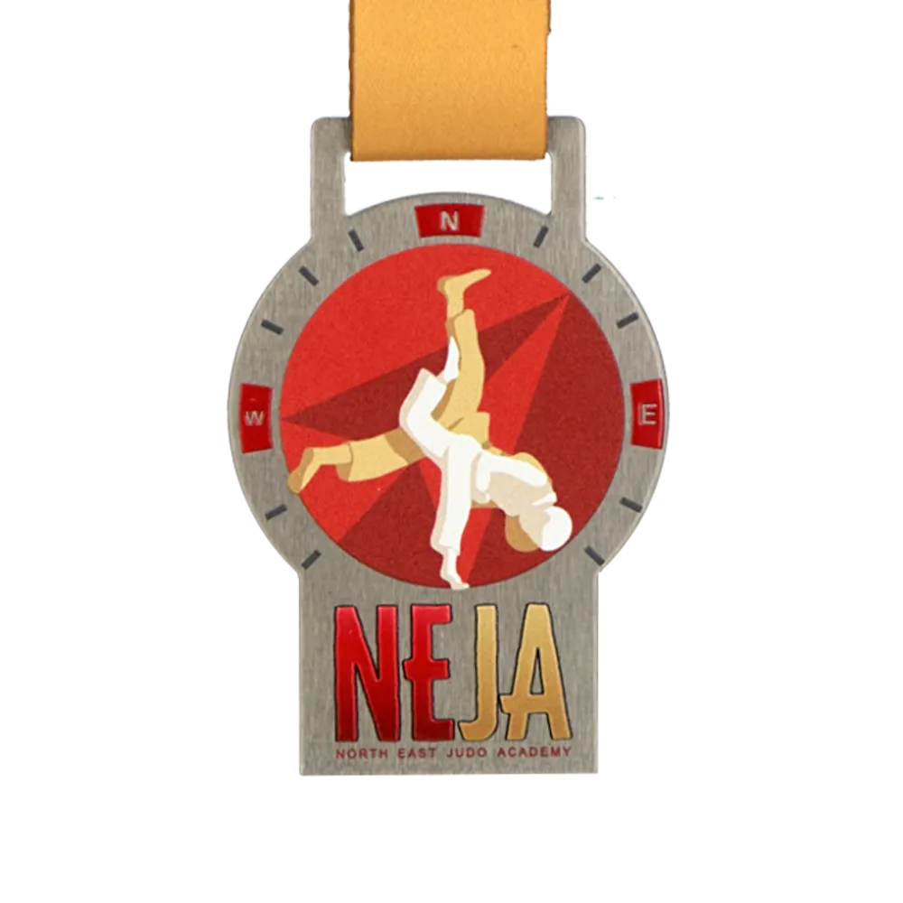 Medaglia su misura prodotta per la competizione della North East Judo Academy, realizzata in acciaio. La forma combina un disco rotondo con una base rettangolare. Il disco presenta due judoka a metà lancio — una silhouette bianca e oro su sfondo rosso con un motivo geometrico. La cornice attorno al disco richiama una bussola con i contrassegni N, O, E. La base mostra la grande scritta NEJA insieme al nome completo dell'accademia. Nastro dorato.
