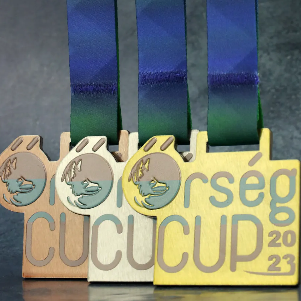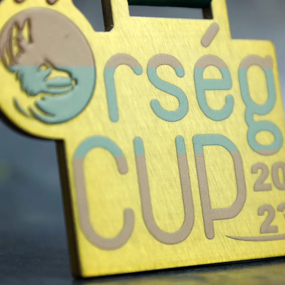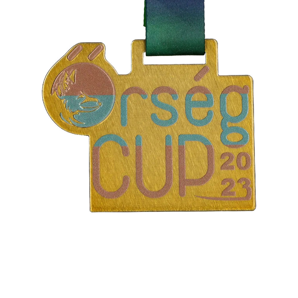 Una medaglia personalizzata realizzata per la Őrség Cup 2023. La medaglia ha una forma unica, con decorazioni colorate che riflettono il tema della competizione.