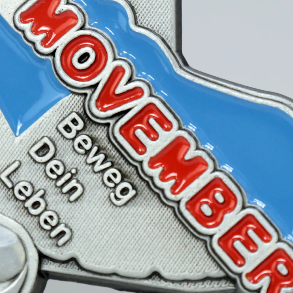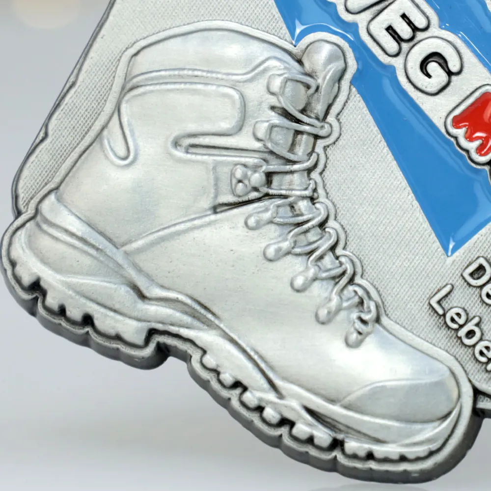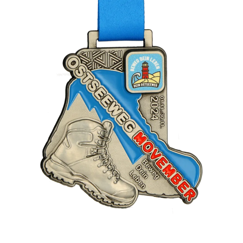 Una medaglia pressofusa a forma di scarpone da trekking, progettata per l'evento Ostseeweg Movember 2024. La caratteristica centrale è uno scarpone stilizzato contro uno sfondo blu di sentiero e montagna, a simboleggiare escursioni a lunga distanza. La medaglia include dettagli dell'evento, come il logo del faro e le date. Colori vivaci come blu e rosso aggiungono energia al design. Perfetta per gli appassionati di escursionismo e i sostenitori di uno stile di vita sano.