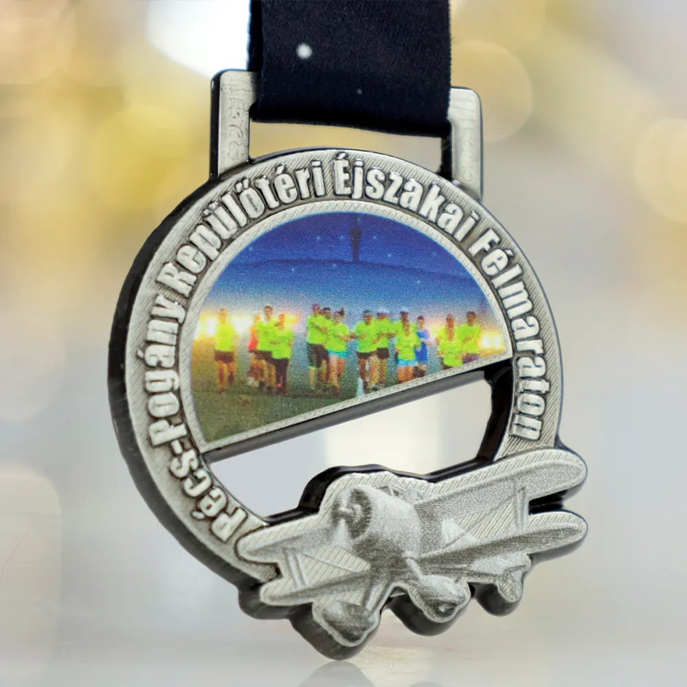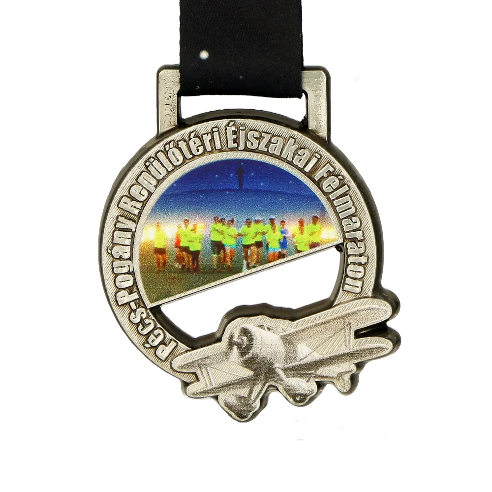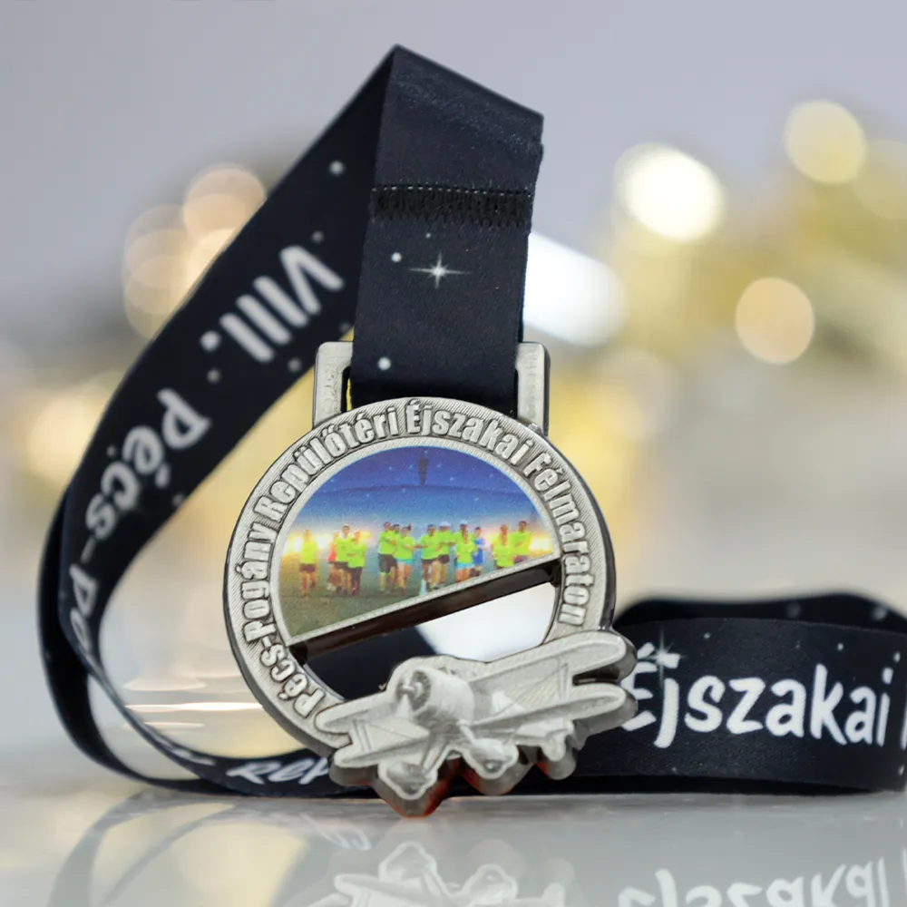 Medaglia personalizzata pressofusa, progettata per la Pécs-Pogány Repülőtéri Éjszakai Félmaraton – una mezza maratona notturna in aeroporto. La medaglia ha una forma insolita, caratterizzata da un aeroplano in rilievo e una stampa UV colorata raffigurante corridori contro un cielo notturno. Sospesa su un nastro nero, abbinato al tema notturno della gara.