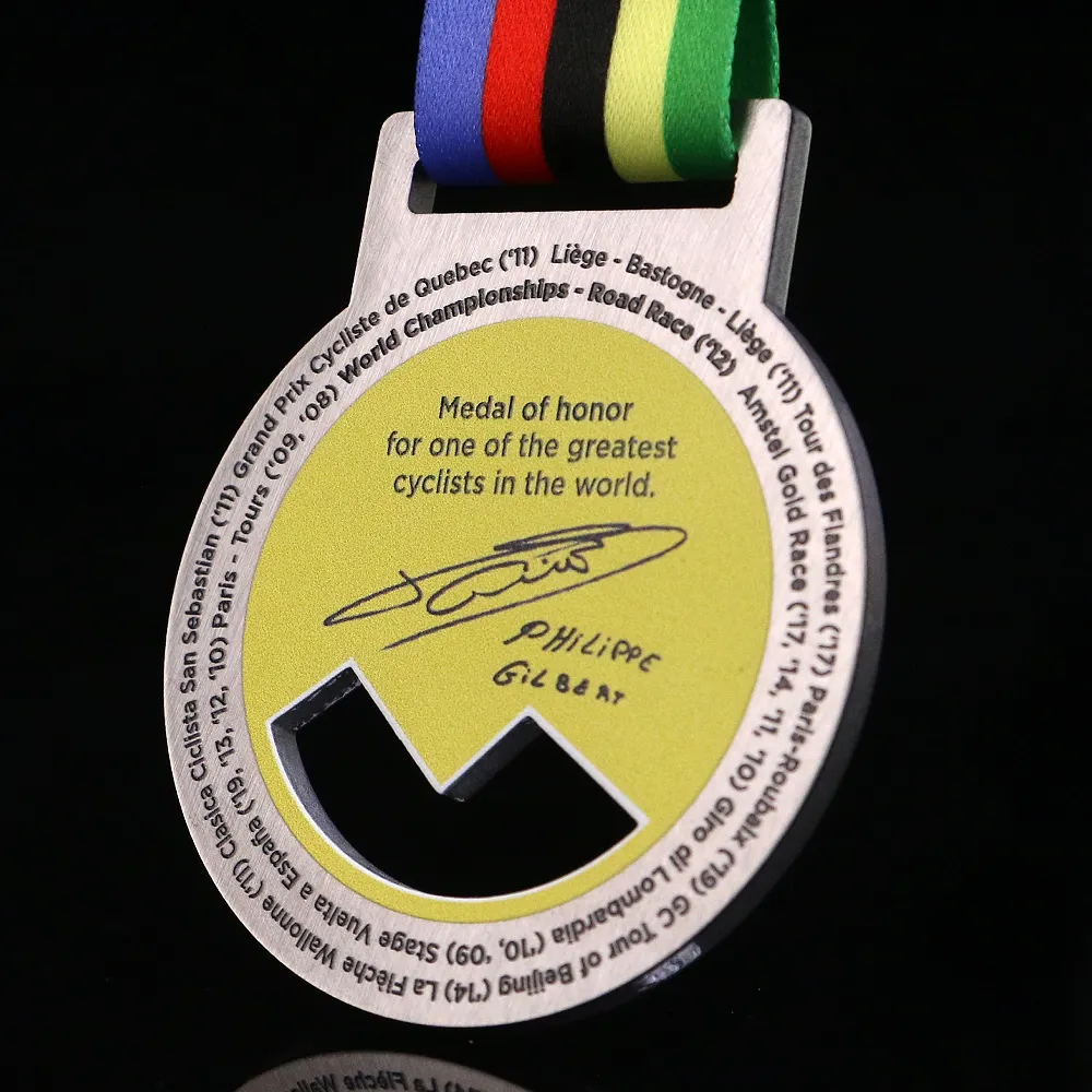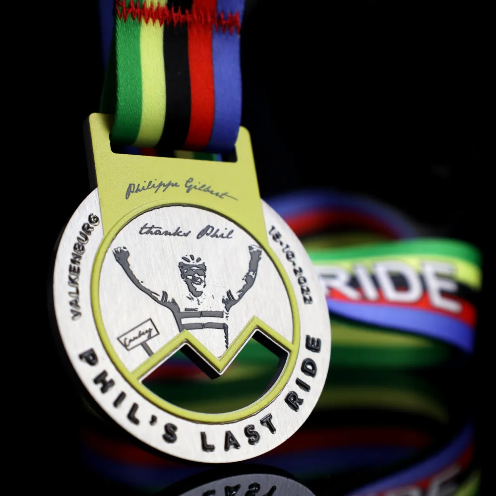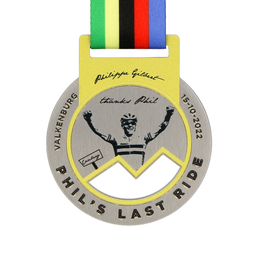 Le medaglie non sono solo simboli di vittoria. Sono anche una sorta di biglietti da visita dell’organizzatore dell’evento. Trasmettono contenuti importanti che dovrebbero essere enfatizzati da una chiara applicazione sulla superficie del premio. L’esempio di tale è la medaglia per la Phil’s Last Ride. Questa medaglia in acciaio stampato ha una forma rotonda diversificata da un preciso ritaglio situato all’interno. Enfatizza perfettamente la figura stampata che esegue il gesto della vittoria. Una stampa UV colorata si trova sia sul dritto che sul rovescio della medaglia. Grazie a questo la medaglia appare bellissima da ogni lato. Vale anche la pena notare che questa medaglia da ciclismo è piena di iscrizioni accuratamente realizzate. Grazie ad esse i partecipanti premiati ricorderanno il motto e l’atmosfera della competizione più a lungo.