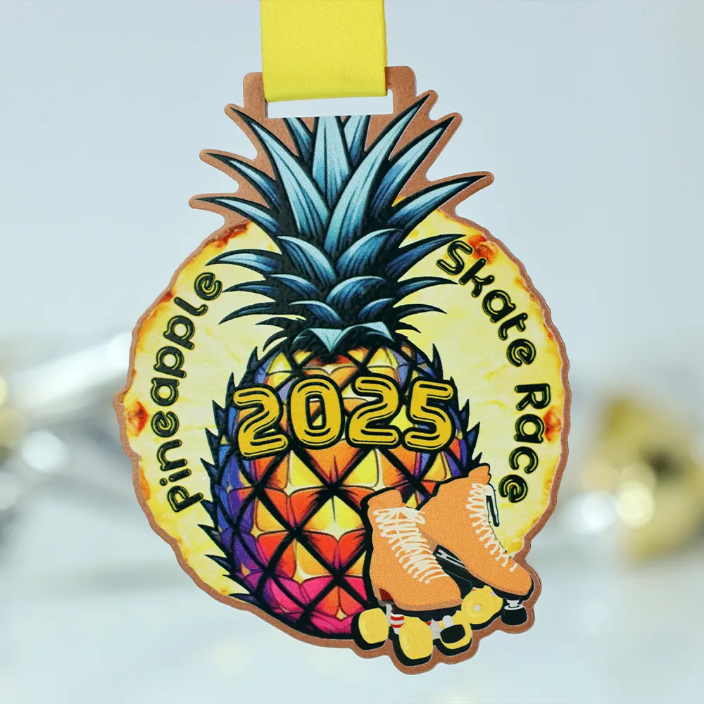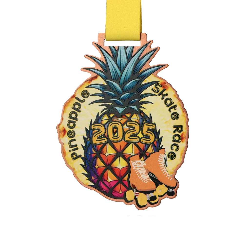 Queste medaglie in acciaio personalizzate realizzate per la Pineapple Skate Race 2025 si distinguono per la forma irregolare e precisa che ricorda un ananas con la sua caratteristica corona verde. Grazie all'uso della moderna tecnologia di stampa UV, siamo riusciti a ottenere colori straordinariamente saturi e dettagli minuziosi, come la texture del frutto, le palme sullo sfondo o la silhouette dinamica del pattinatore.