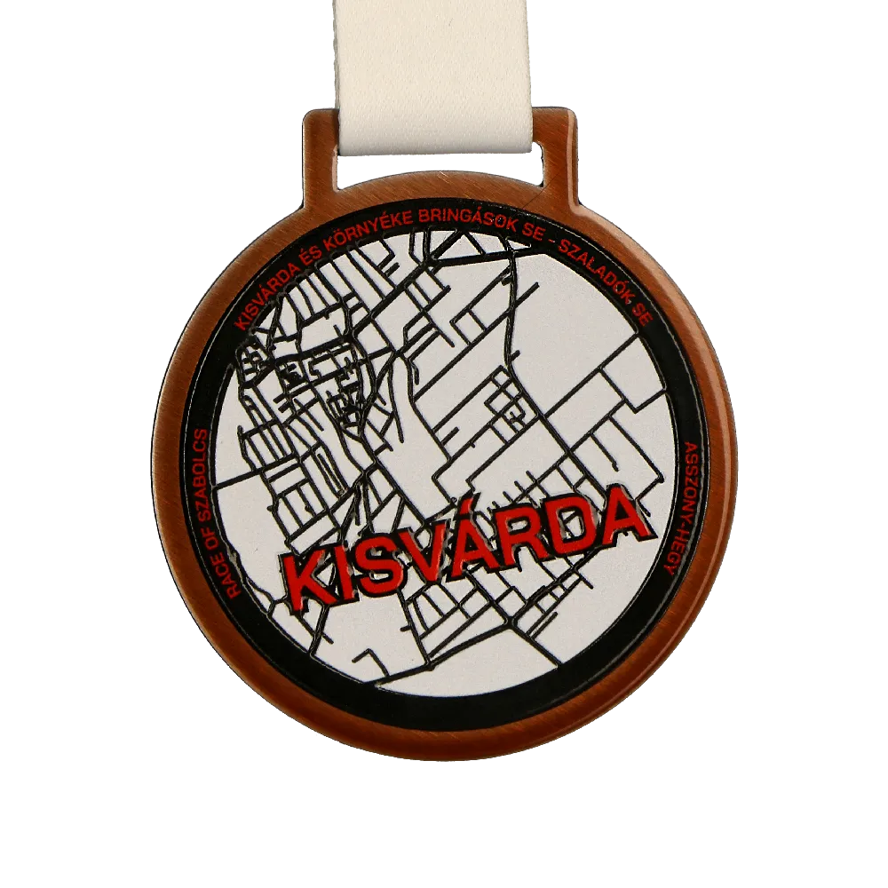 Per la Gara di Szabolcs abbiamo utilizzato la tecnologia moderna per creare medaglie straordinarie. Come rinomato fornitore di medaglie abbiamo assicurato che le medaglie in acciaio stampato avessero una forma e decorazioni uniche. Abbiamo scelto una classica forma rotonda aggiunto una stampa colorata con un effetto 3D e rifinito il tutto con una vernice lucida. La vernice cattura la luce e attira l’attenzione sulla medaglia. Abbiamo abbinato le medaglie con nastri classici e possiamo persino offrire portamedaglie abbinati. In questo modo gli atleti onorati possono esporre con orgoglio i loro premi.