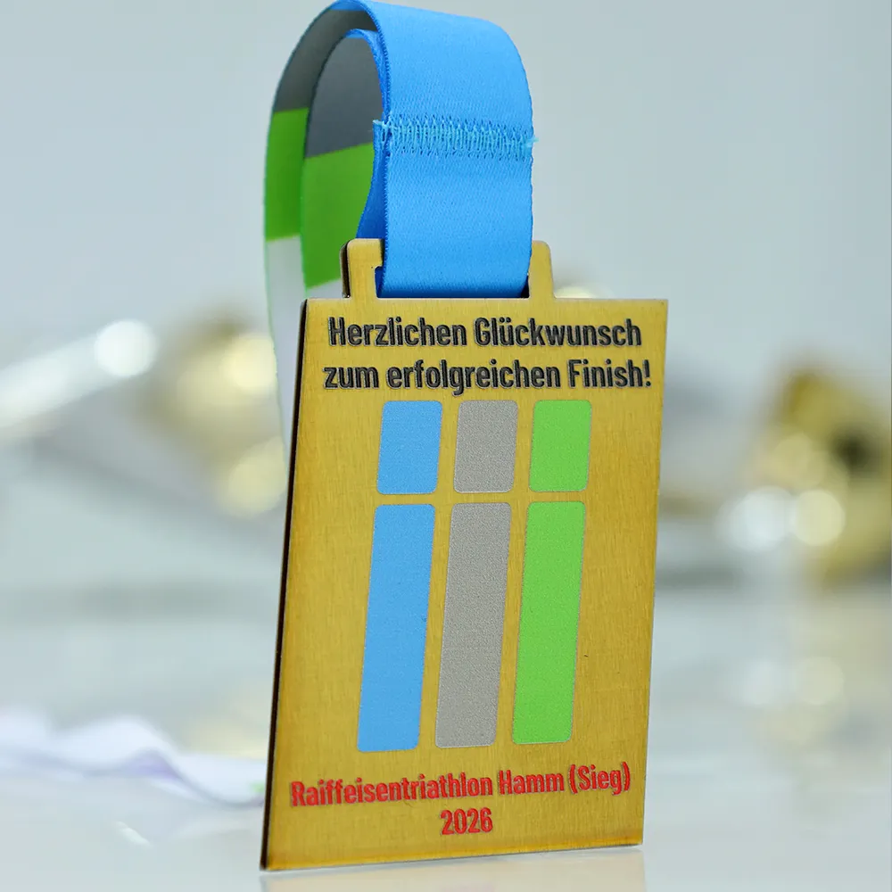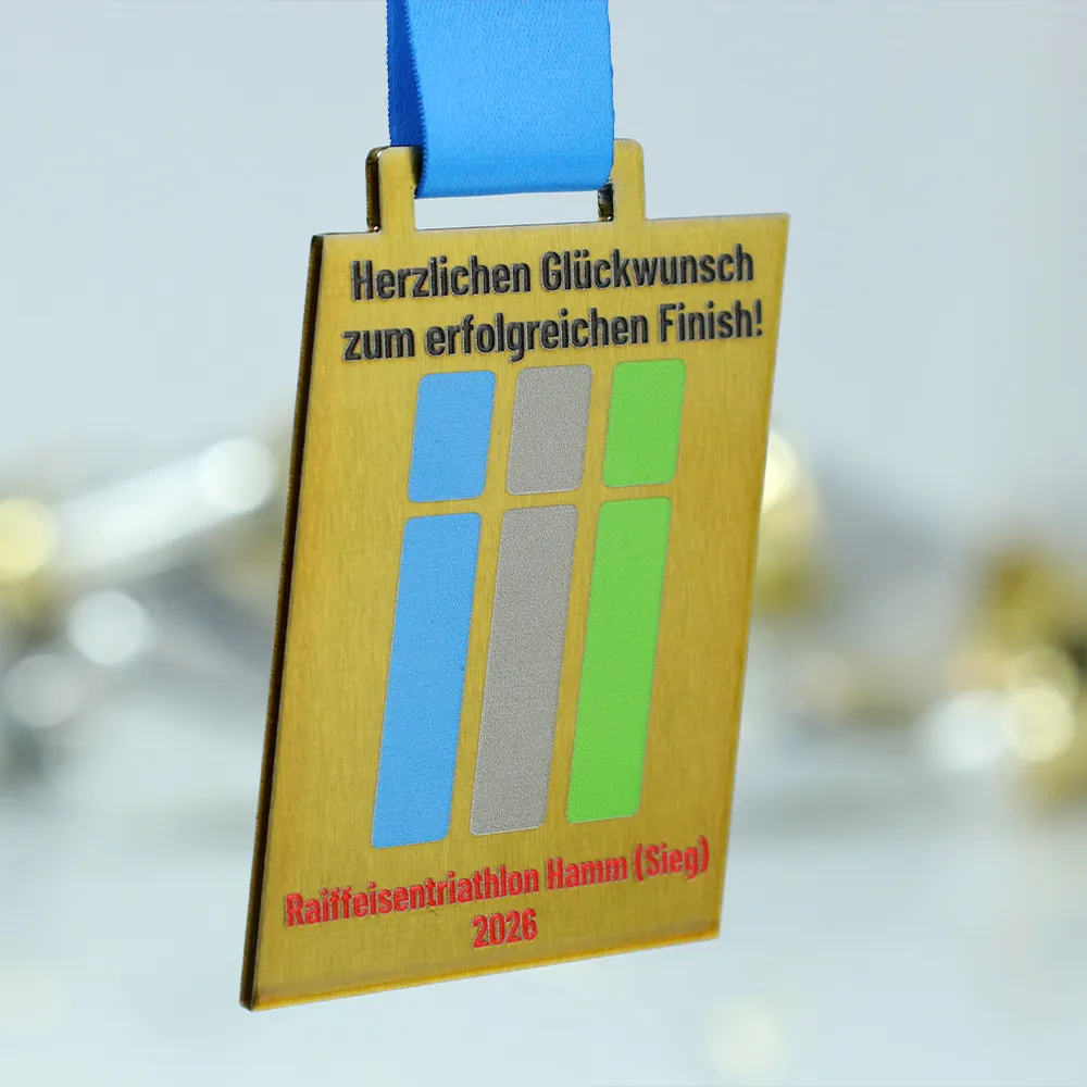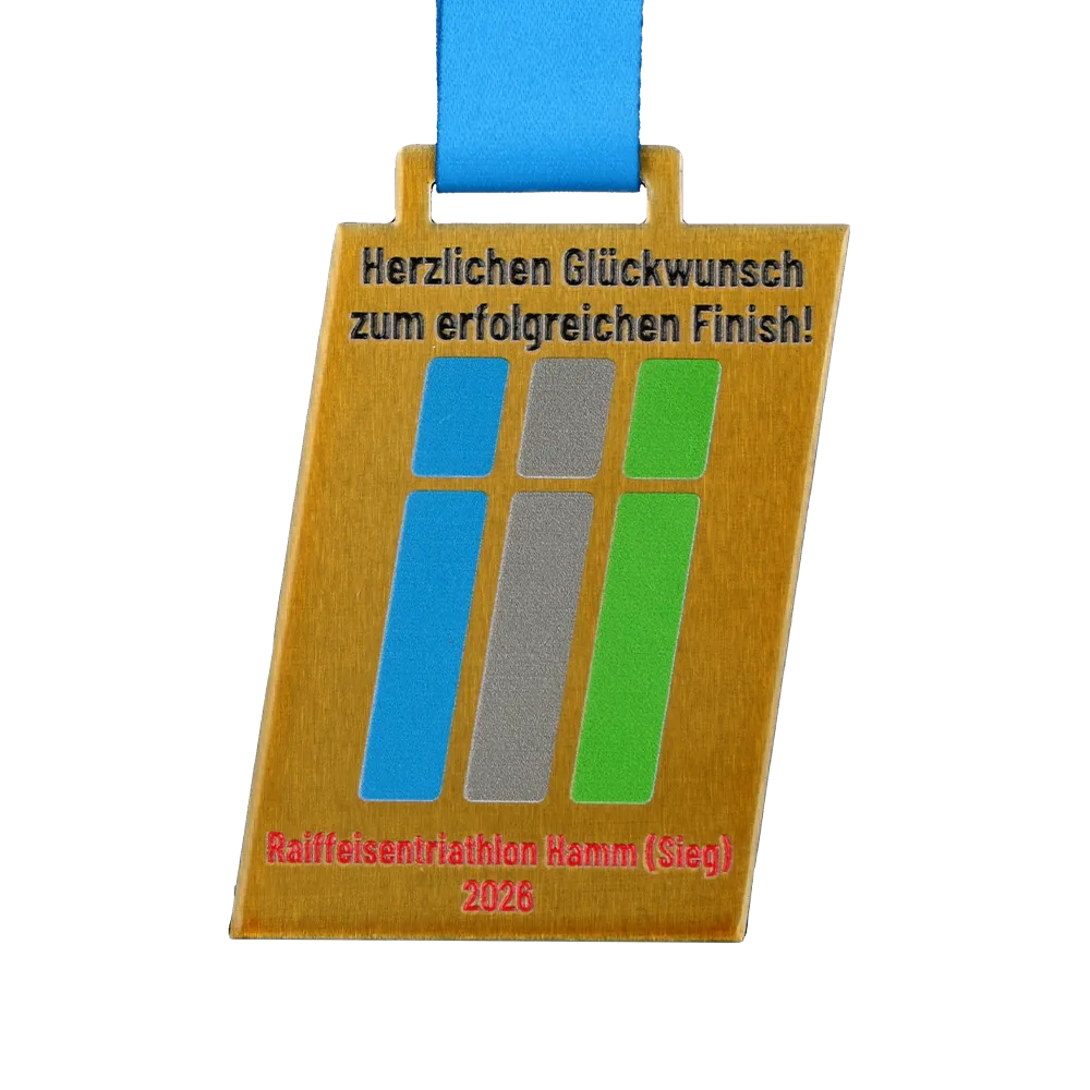 Le medaglie personalizzate progettate per il Raiffeisen Triathlon Hamm attirano lo sguardo con una forma obliqua insolita e un elegante abbinamento di acciaio dorato e nastro azzurro. Gli elementi grafici colorati e il nome dell'evento sono stati realizzati con stampa UV durevole, garantendo un'eccellente leggibilità.