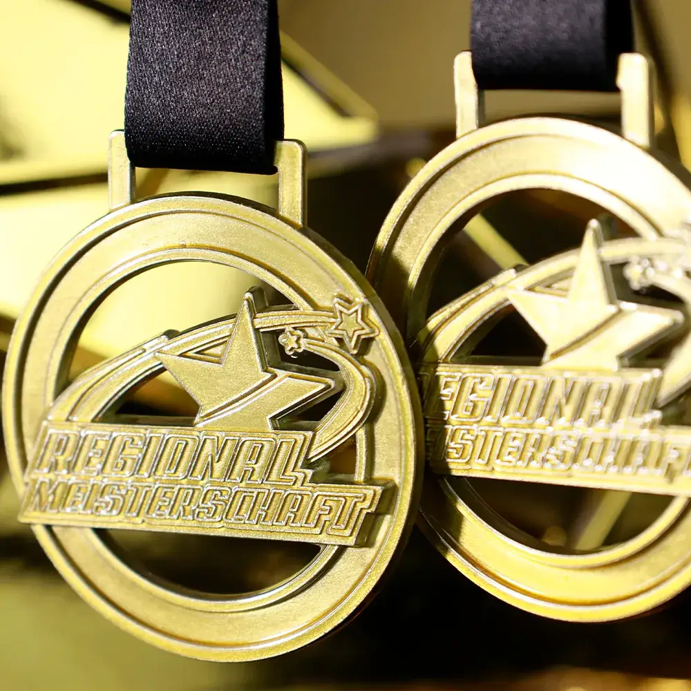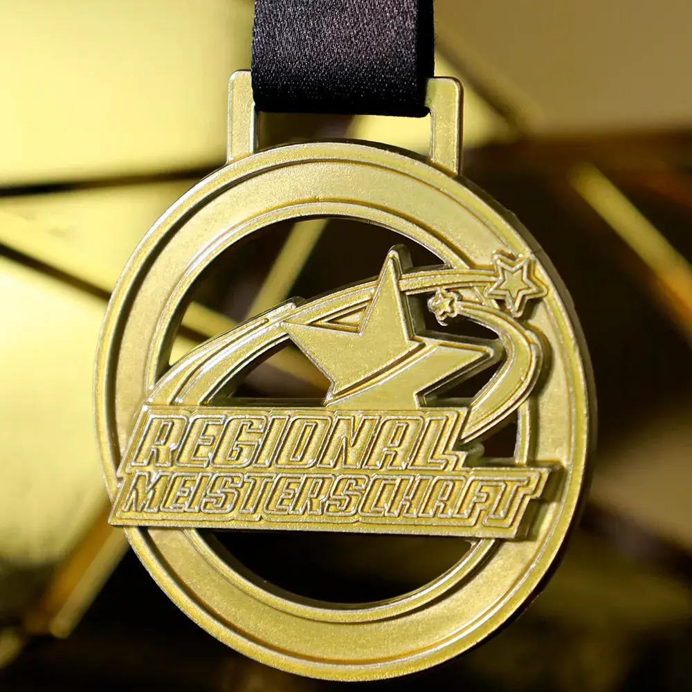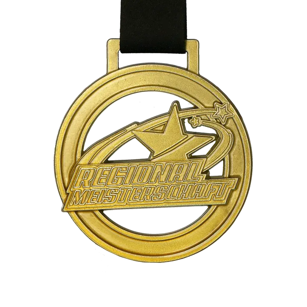Medaglia sportiva creata da noi per il Regional Meisterschaft. La medaglia è in un elegante colore oro, che le conferisce un aspetto prestigioso. Ha una forma rotonda con un motivo a stella centrale circondato da un'orbita e stelle più piccole.