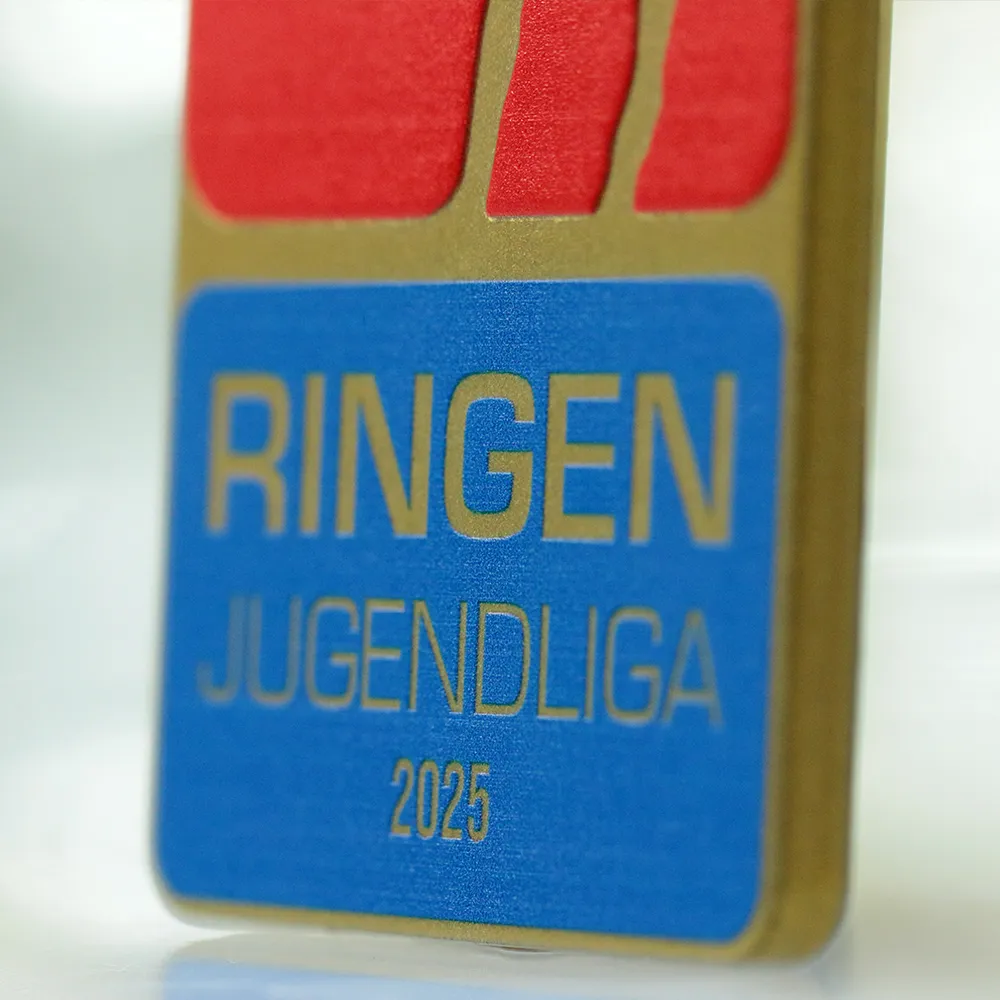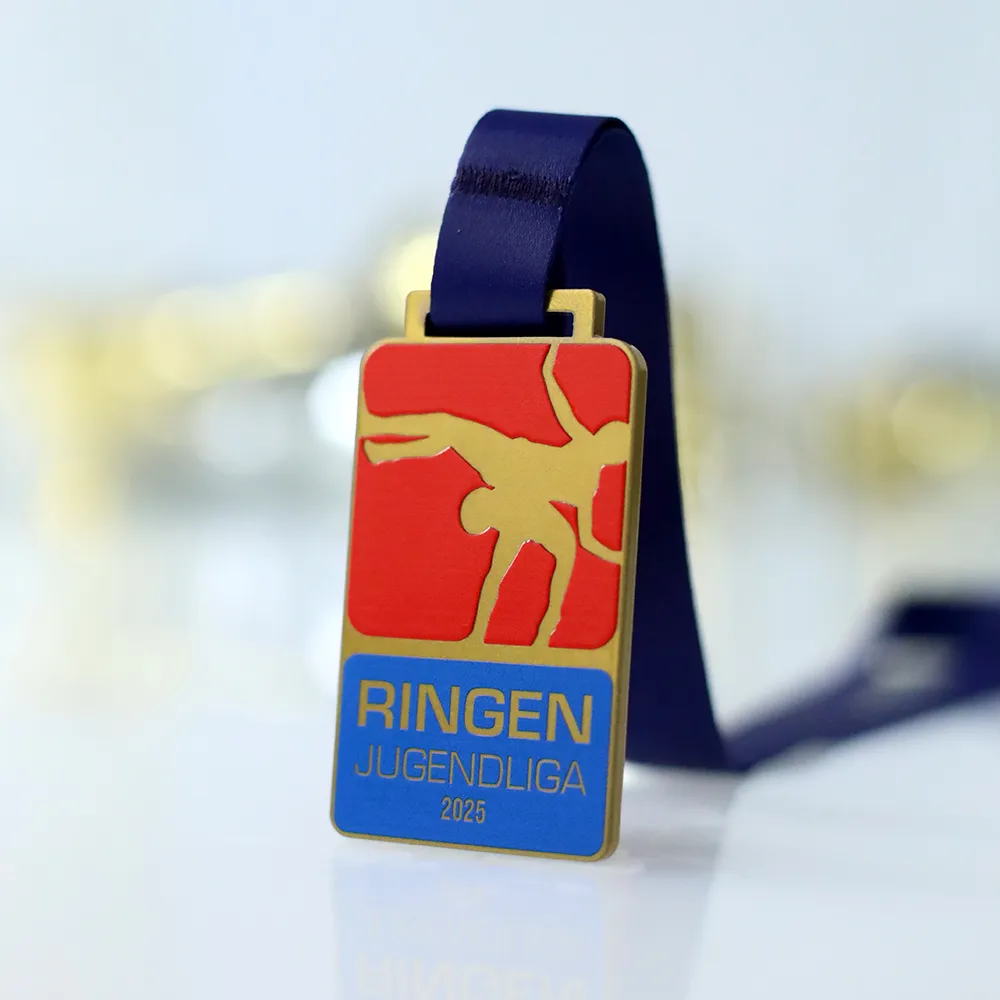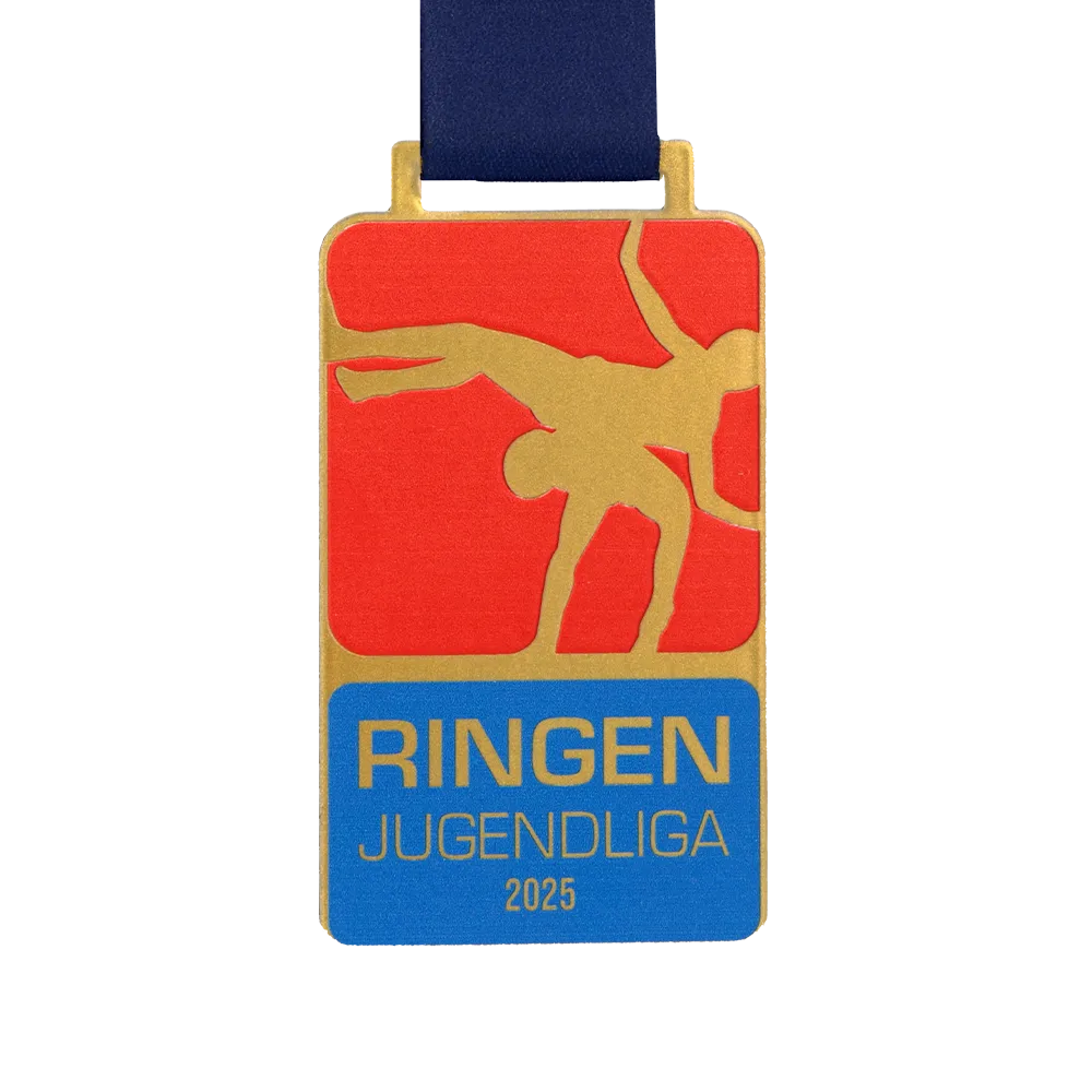 La medaglia di judo in acciaio progettata appositamente per il torneo Ringen Jugendliga 2025 si distingue per la sua forma rettangolare e moderna. L'utilizzo della tecnica di stampa UV ha permesso di ottenere rossi e blu saturi e una texture di fondo opaca, percepibile al tatto. I precisi dettagli dorati e le scritte nitide ne fanno una medaglia personalizzata duratura di elevata qualità estetica.