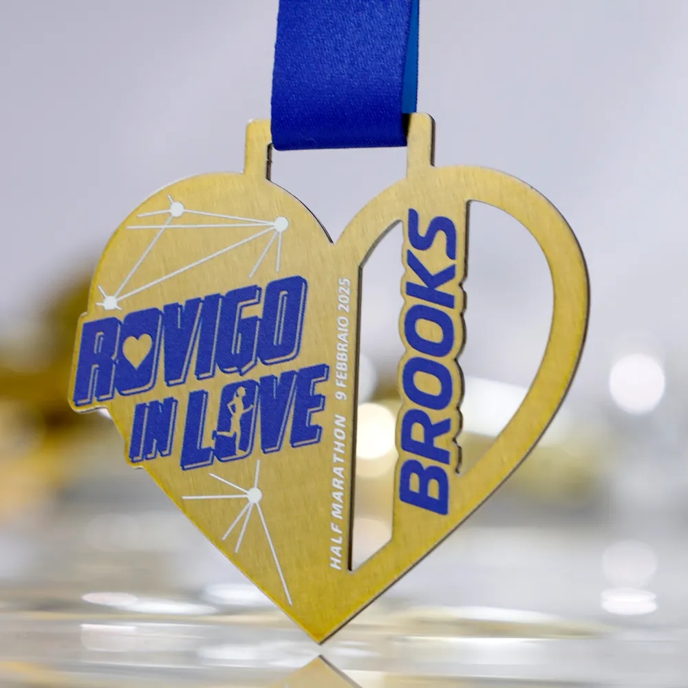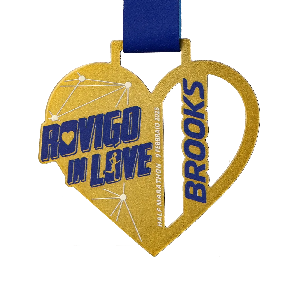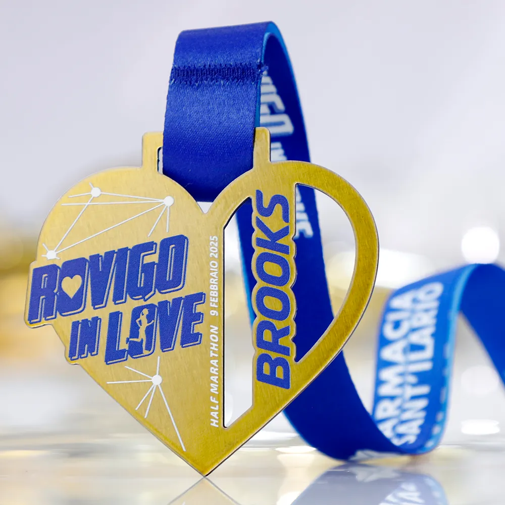 Una medaglia da corsa per la mezza maratona "Rovigo in Love" è una medaglia in acciaio con forme tagliate con precisione utilizzando la tecnologia laser. La medaglia si distingue per il suo colore dorato e le iscrizioni blu dominanti, e il motivo grafico è un cuore con una silhouette di un corridore e un motivo di stelle, realizzato utilizzando la stampa UV. Il nastro blu profondo aggiunge eleganza, enfatizzando perfettamente il carattere sportivo della medaglia.