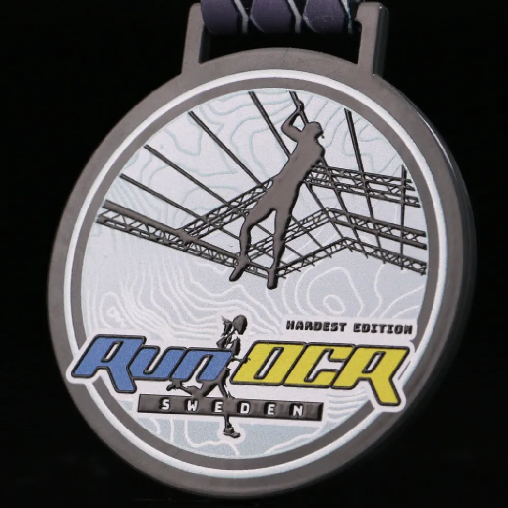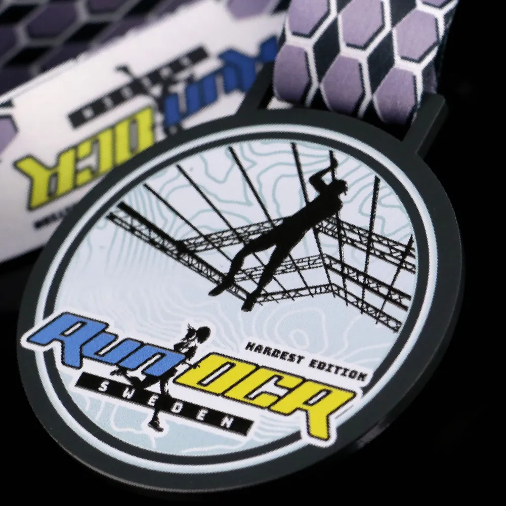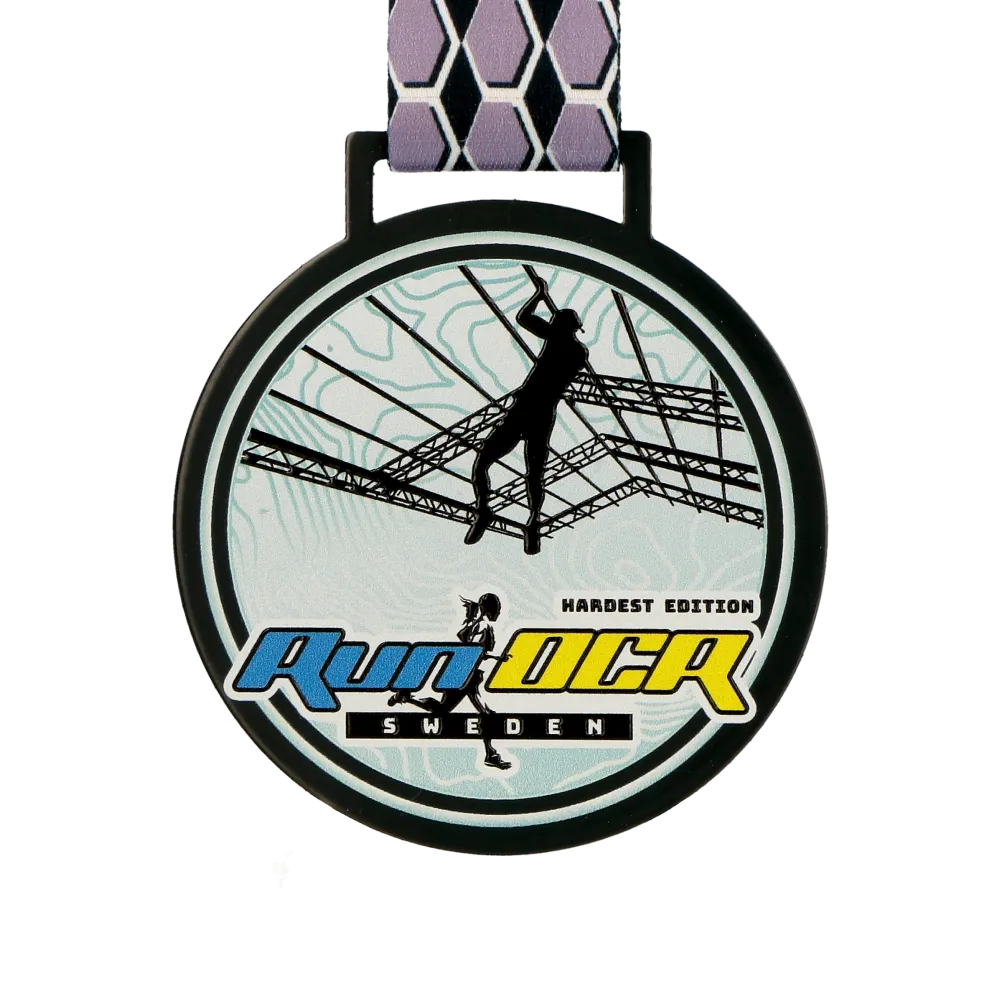 Le persone che amano il brivido e l’adrenalina sono fantastiche nel competere nei percorsi a ostacoli. Durante essi possono non solo mostrare le loro abilità sportive ma anche divertirsi davvero. Uno di questi eventi è la Run OCR Sweden – una competizione incredibile per la quale abbiamo preparato originali medaglie di altissima qualità. Hanno una classica forma rotonda e colore nero che è lo sfondo perfetto per la stampa colorata del motivo del percorso a ostacoli che abbiamo posizionato sull’intera superficie della medaglia. C’è anche il nome dell’evento grazie al quale i partecipanti ricorderanno l’occasione di aver vinto la medaglia per molto tempo. Il tutto è completato da un nastro a sublimazione abbinato al design del premio.