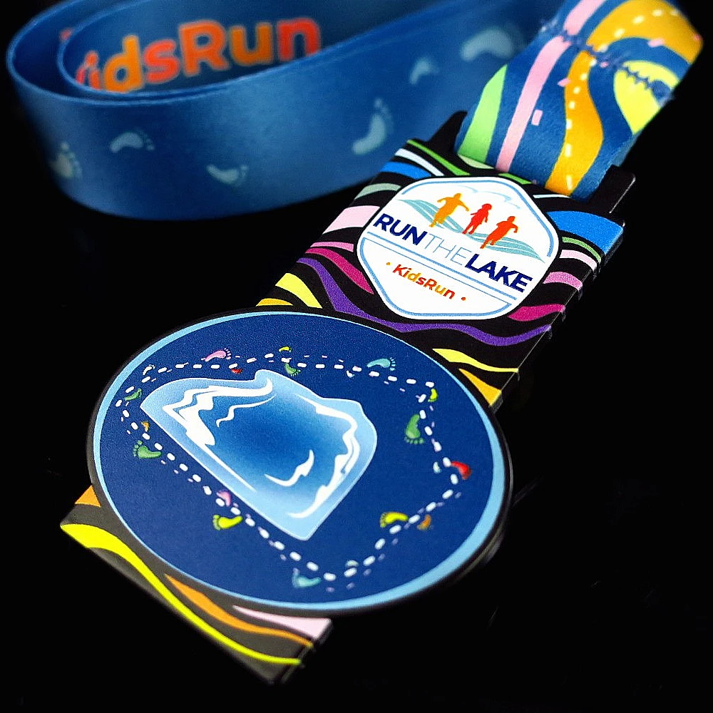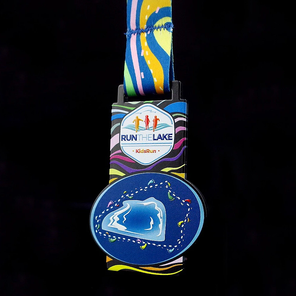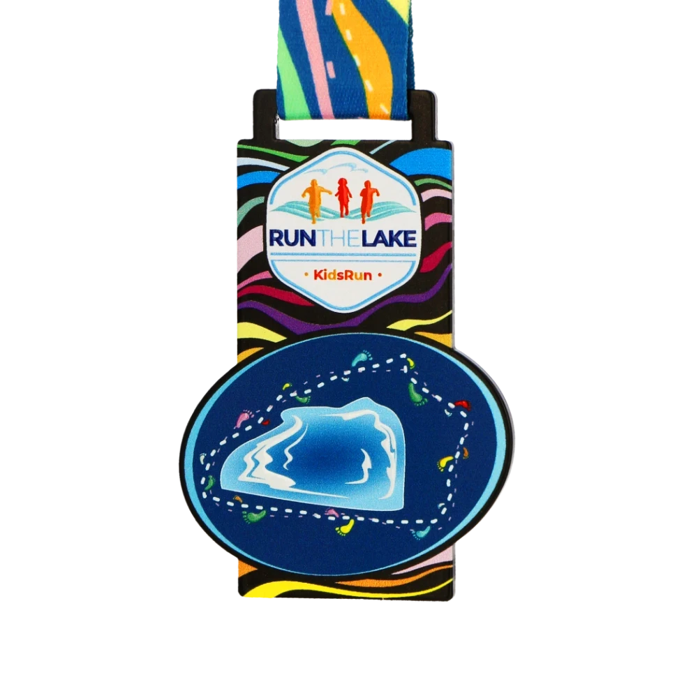 La risposta è semplice: colori vivaci. Queste medaglie da corsa per bambini presentano una forma unica che combina un rettangolo e un ovale creando un design accattivante. Lo spazio extra consente bellissime decorazioni come la grafica del lago e il percorso di corsa, catturando perfettamente lo spirito della Run The Lake.