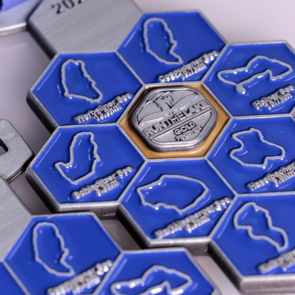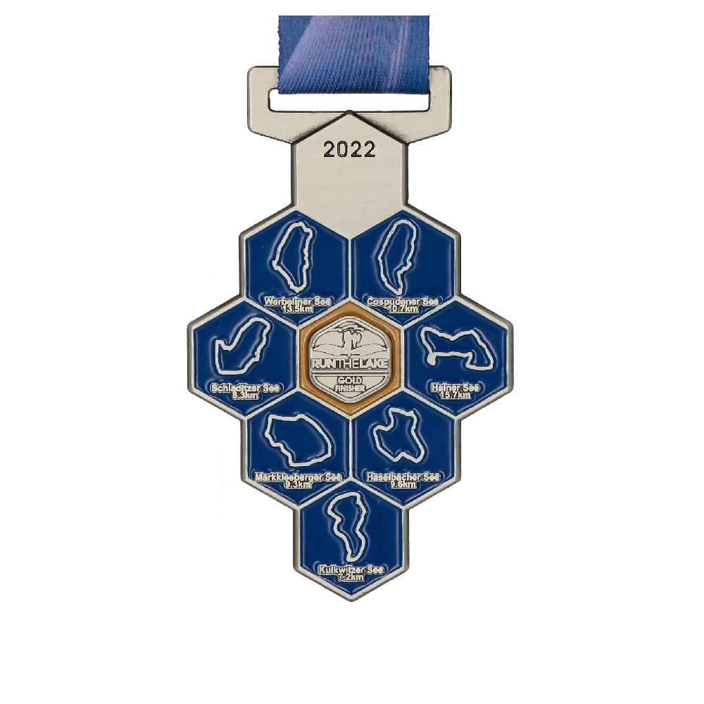 Run The Lake è un evento podistico unico che offre ai partecipanti la possibilità di scoprire la bellezza dei laghi locali in Germania. Ciò si ottiene attraverso varie distanze di corsa. Ogni lago offre un paesaggio unico e percorsi su misura per diversi livelli di forma fisica. L’evento promuove uno stile di vita sano e l’amore per la natura, offrendo anche un’opportunità di competizione atletica. Su richiesta degli organizzatori abbiamo creato medaglie su misura per questo evento. La forma distintiva della medaglia raffigura mappe di laghi, ciascuna assegnata a una distanza specifica. La parte centrale della medaglia è evidenziata con il logo dell’evento. Questo è completato da un nastro personalizzato. Questa medaglia da corsa è un must nella tua collezione.