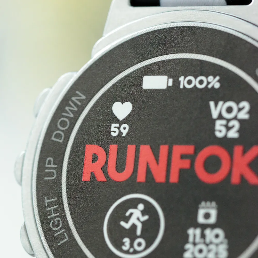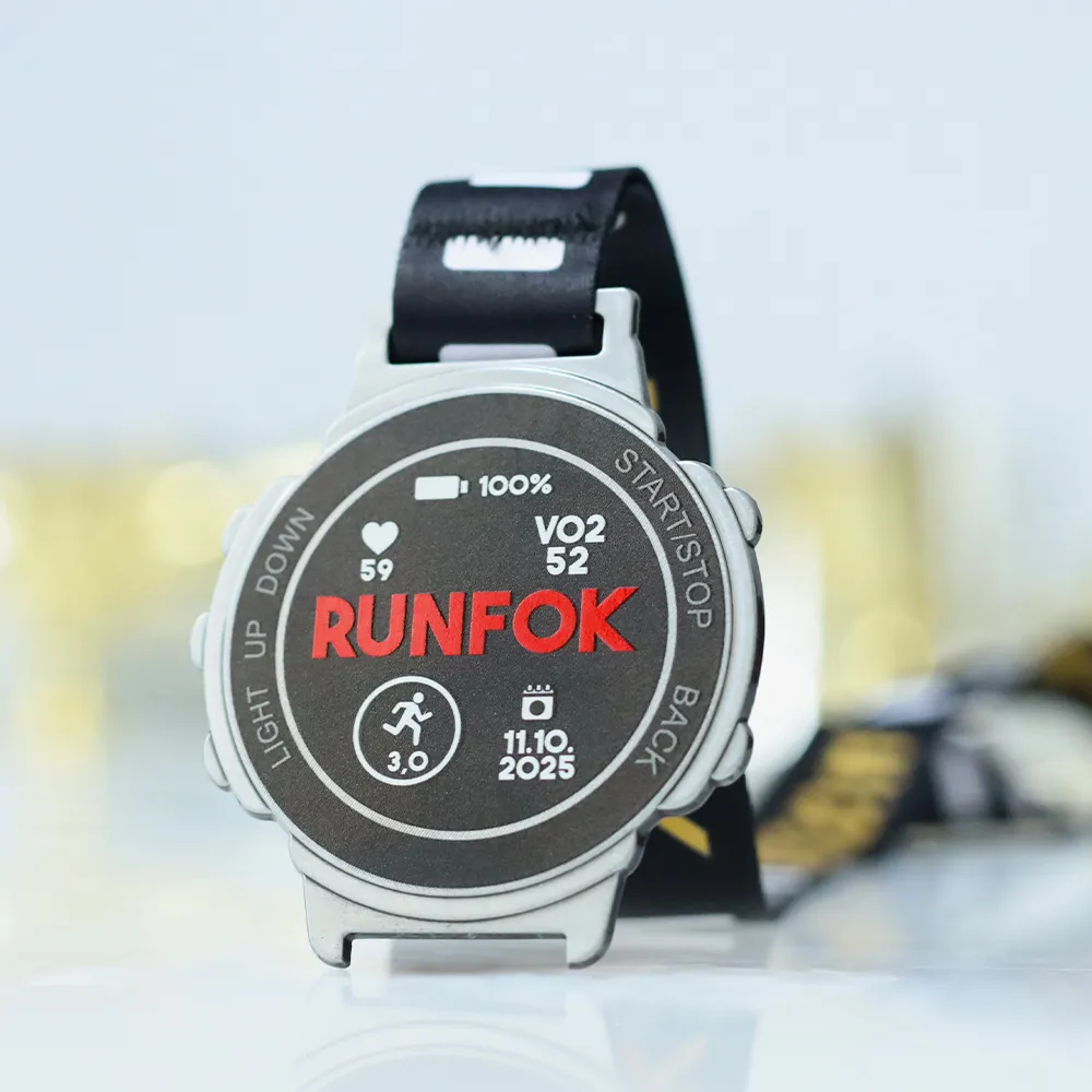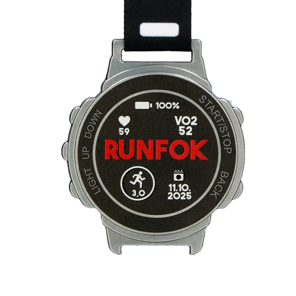 La medaglia da corsa Runfok 2025 è stata realizzata in lega di zinco ad alta resistenza. L'applicazione della tecnica di stampa UV ha consentito di riprodurre con precisione l'interfaccia di un orologio sportivo, conferendo ai dettagli rossi e bianchi una texture percepibile al tatto. Questa medaglia personalizzata dalla forma originale, con elementi a rilievo che imitano i pulsanti, rispecchia perfettamente il carattere tecnologico dell'evento.