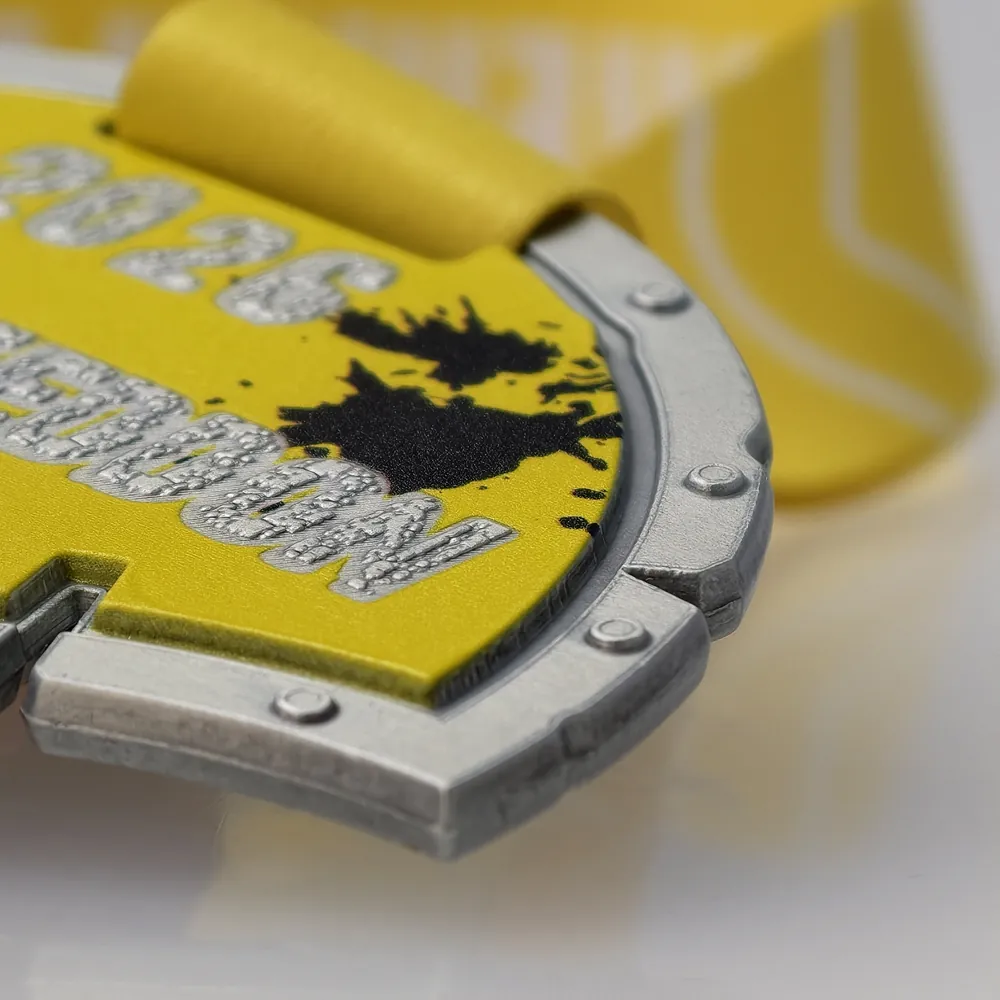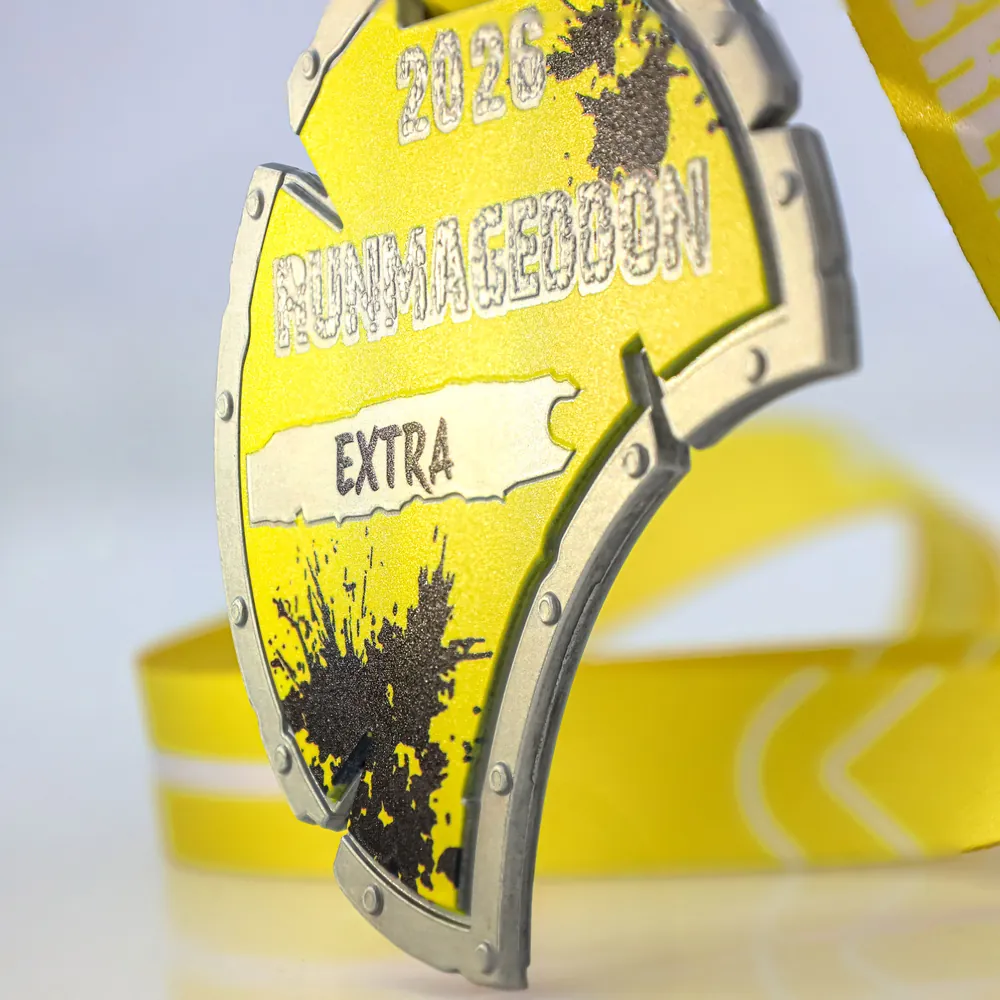 La medaglia Runmageddon Extra 2026 è stata realizzata in una resistente lega di zamak, che le conferisce solidità e bordi precisi. La tecnica della fusione ha permesso di ottenere una forma grezza con dettagli che imitano i rivetti, mentre la stampa 3D conferisce alle scritte e ai motivi grafici neri una struttura tattile. La base argentata, abbinata a uno sfondo giallo intenso, garantisce un'elevata leggibilità di tutti gli elementi di personalizzazione.