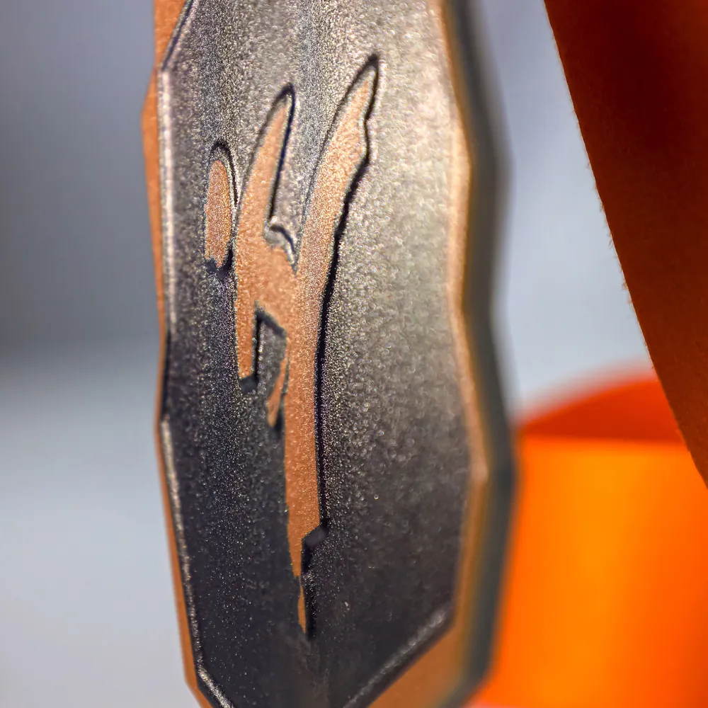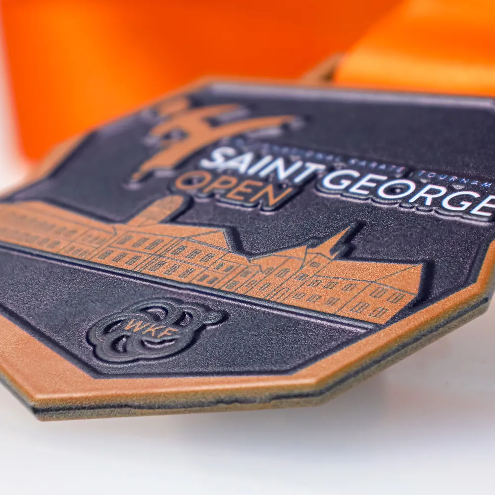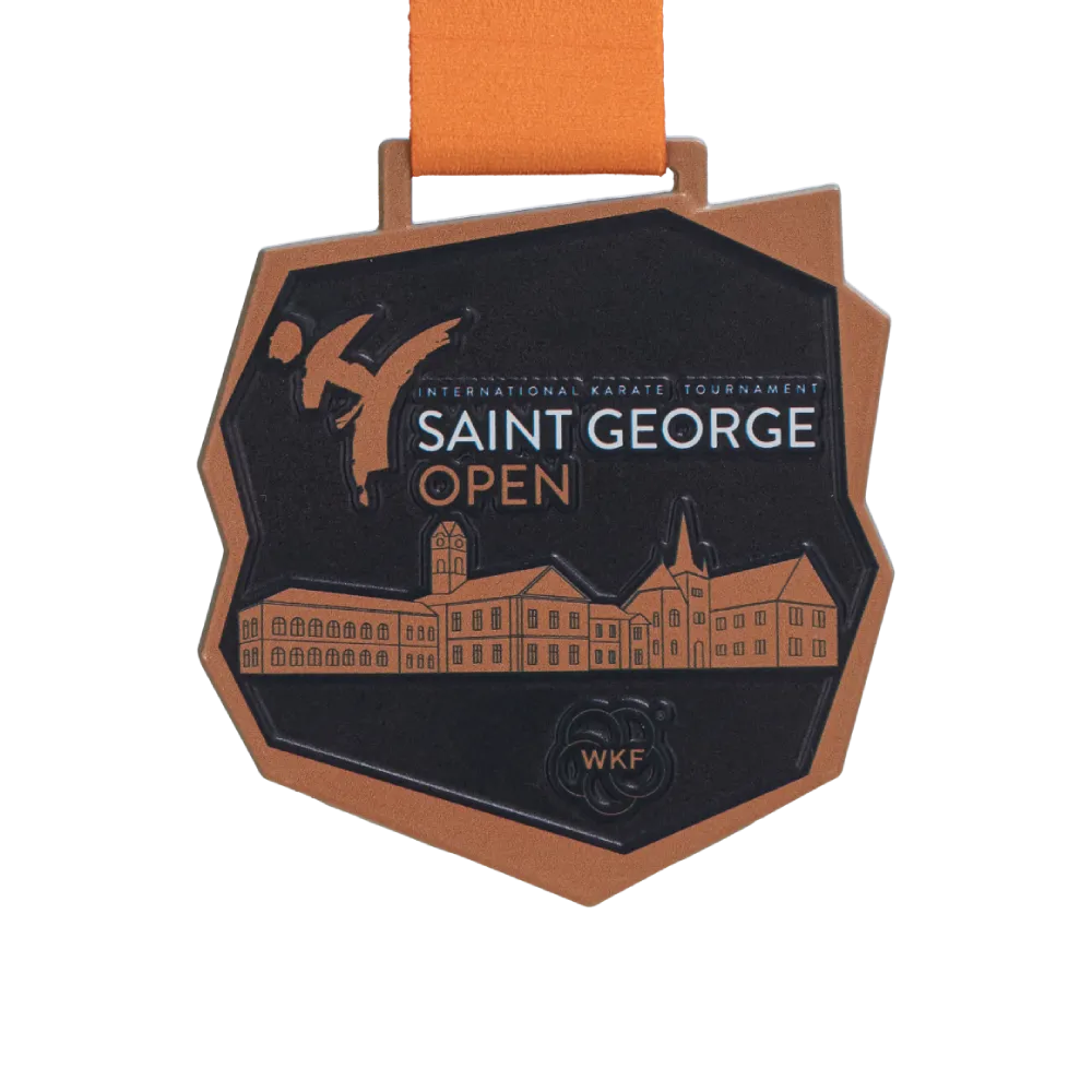 La medaglia in acciaio del torneo Saint George Open si distingue per la sua moderna forma poligonale, tagliata al laser con precisione. La tecnica di stampa 3D utilizzata dona alla grafica un'eccezionale profondità, rendendo il panorama della città e la silhouette del karateka chiaramente percepibili al tatto.