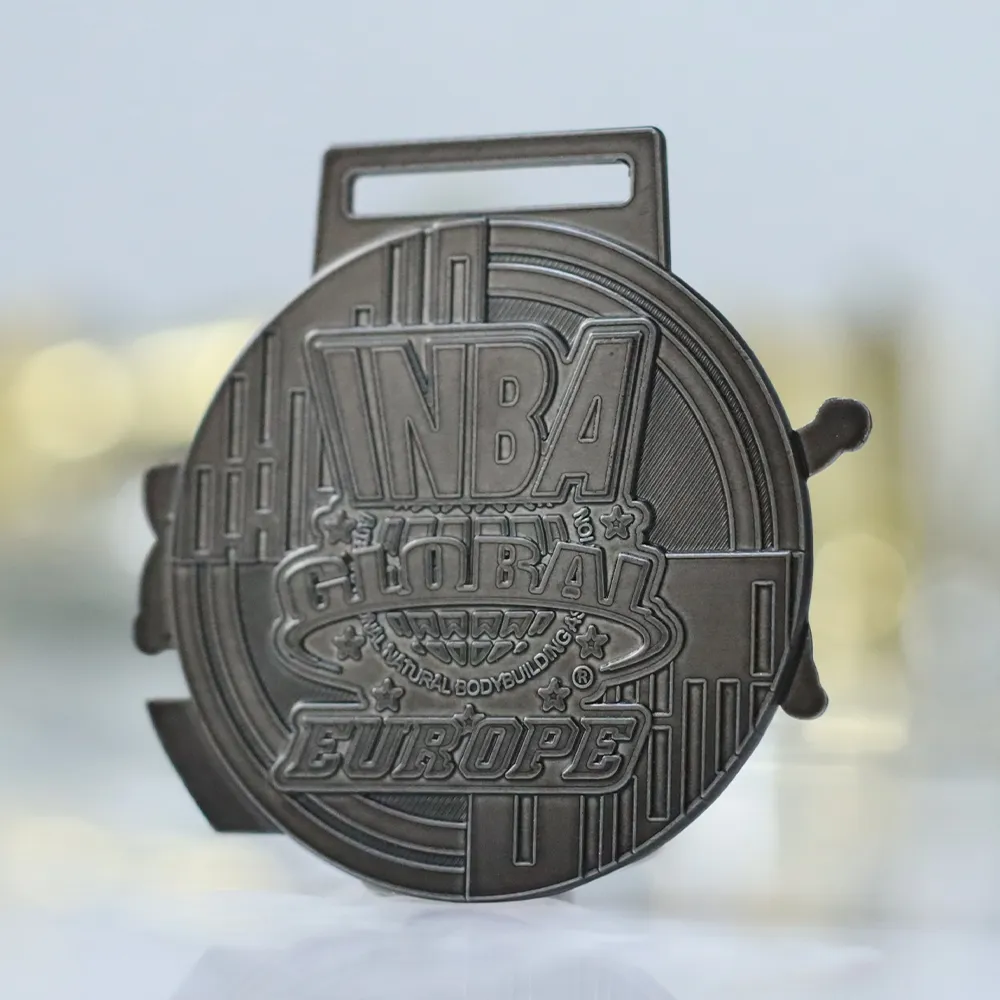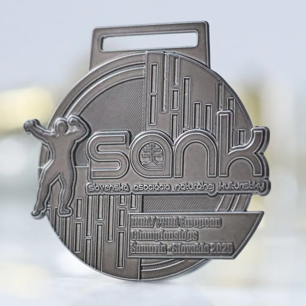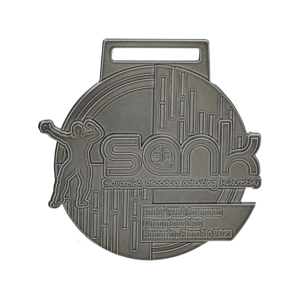 La medaglia rotonda in lega di zinco realizzata per l'evento Sank 2025 unisce un design contemporaneo alla forma classica di un trofeo sportivo. La tecnica di fusione utilizzata garantisce una texture percepibile al tatto e una finitura elegante dall'aspetto antico, che si abbina perfettamente all'anello rettangolare per il nastro. Queste medaglie fuse sono la scelta ideale per gli organizzatori che cercano prodotti di alta qualità adattati al 100% al carattere prestigioso della competizione.