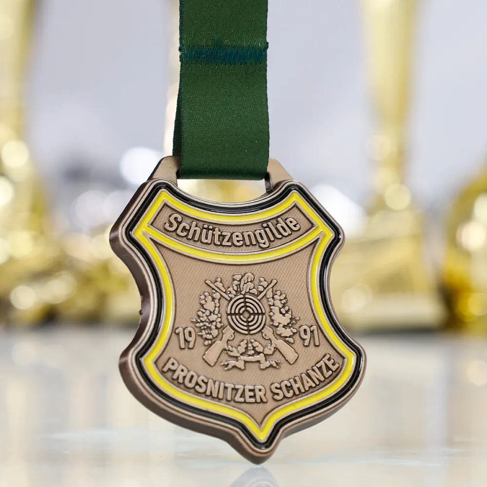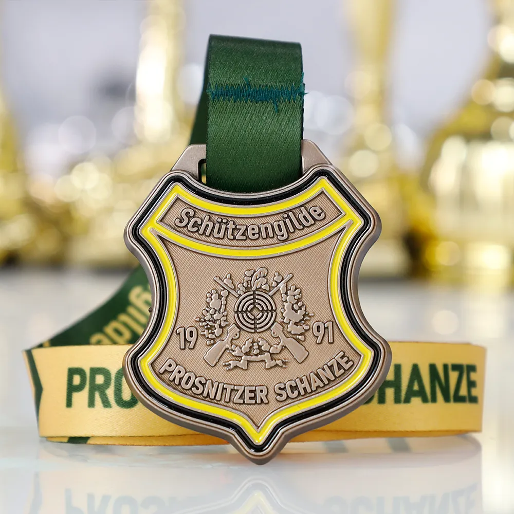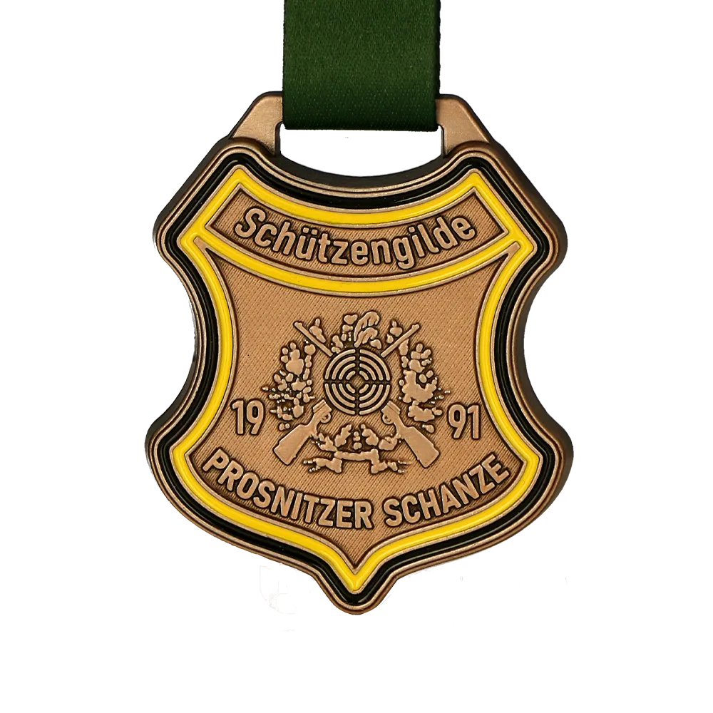 Una medaglia di tiro progettata per Schützengilde Prosnitzer Schanze. La medaglia presenta uno scudo color bronzo con un bordo giallo e una grafica in rilievo raffigurante un bersaglio di tiro e fucili incrociati. La medaglia reca il nome del club di tiro e l'anno di fondazione, 1991. Il nastro verde completa perfettamente il design, enfatizzando il carattere dell'evento.