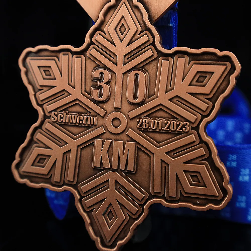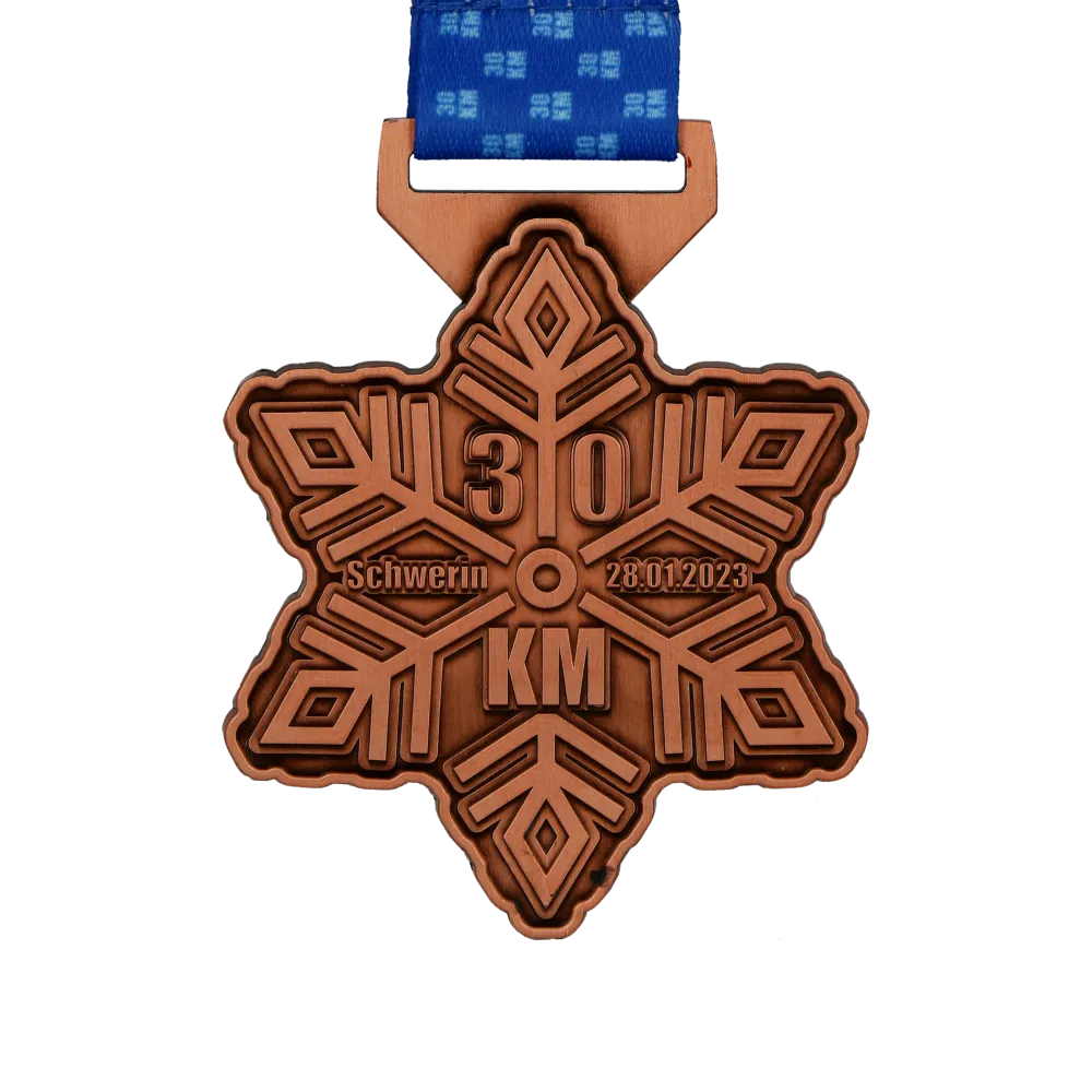 Le Medaglie possono distinguersi per molte ragioni. Una di queste è la forma che può assumere quasi qualsiasi forma. Nel caso delle medaglie alla Schwerin Run abbiamo optato per una forma che ricorda un fiocco di neve. Poiché si tratta di medaglie in fusione stampate siamo stati in grado di ottenere la loro forma attraverso uno stampo progettato individualmente. Con il suo aiuto abbiamo anche ottenuto decorazioni tridimensionali che possono essere sentite sotto le dita. Inoltre queste decorazioni sono presenti su entrambi i lati della medaglia. Di conseguenza il premio appare bellissimo sia sul dritto che sul rovescio. Inoltre abbiamo personalizzato le medaglie da corsa posizionando il logo dell’organizzatore sulla loro superficie e aggiungendo un nastro abbinato. L’intera presentazione è squisita e ricorda ai destinatari la vittoria ottenuta.