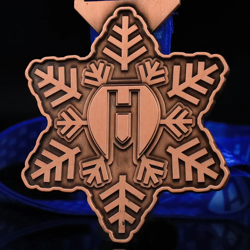 Abbiamo realizzato una solida medaglia pressofusa bifacciale a forma di fiocco di neve con decorazioni tridimensionali e il logo dell'organizzatore.